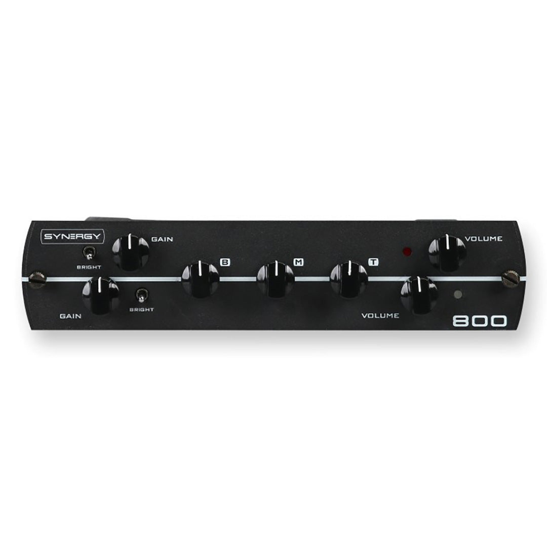 The Synergy 800 features two channels each with gain and volume knobs and a bright switch. Both channels share a three band EQ.
