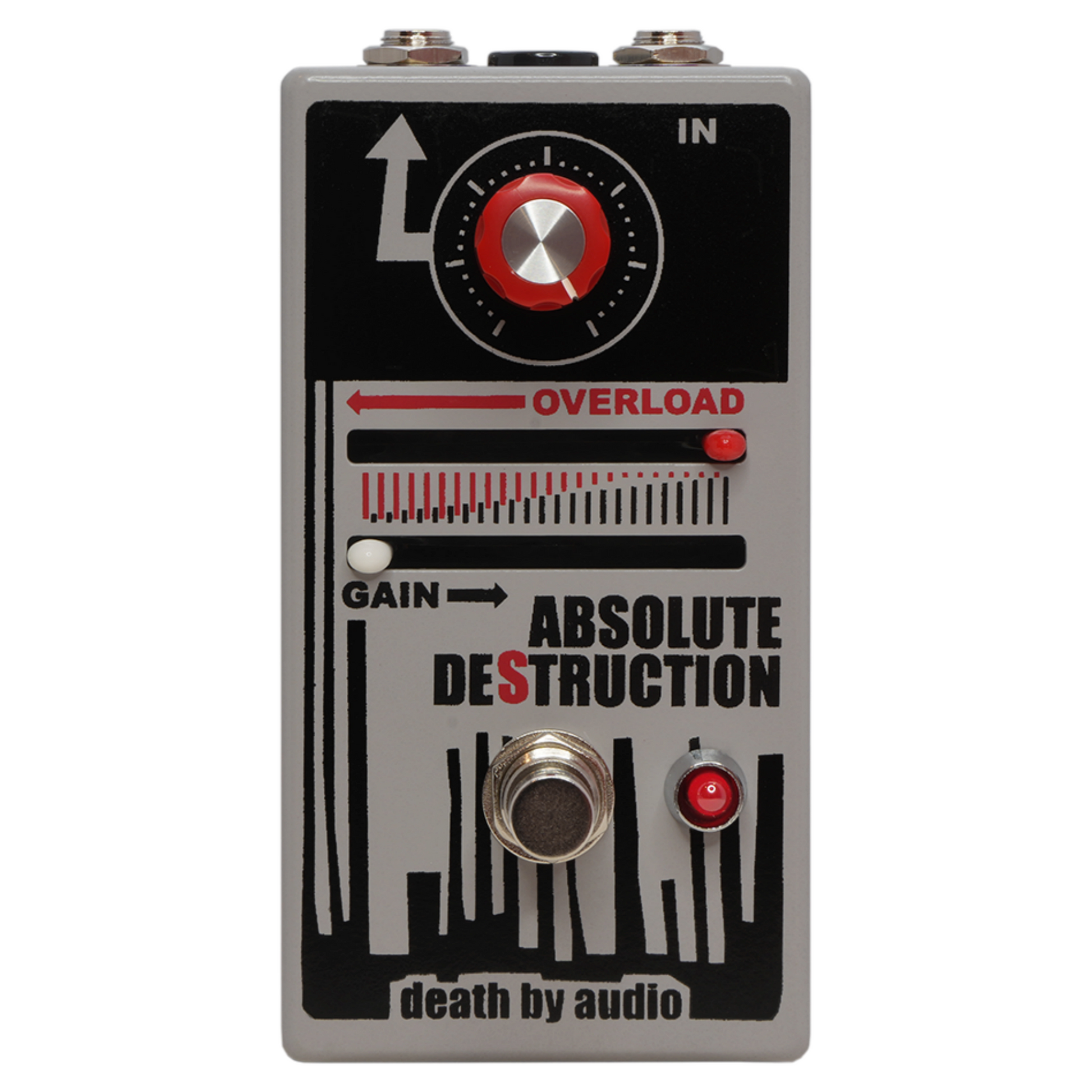 Absolute Destruction may be Death by Audio's craziest pedal. Showing little-to-no respect for what instruments normally sound like, or even what people want them to sound like, we pushed this thing until it sounded fully unhinged. Want a thick, gnarly fuzz sound? How about a crushing distortion tone? Sure, you can do that, and it'll sound great. But you can also push the OVERLOAD slider into blooming, octave nastiness; push it further and starve the circuit until your signal eats itself. Crank it to the maximum and your sound will duck completely into the void before it returns to life with a relentless vengeance.