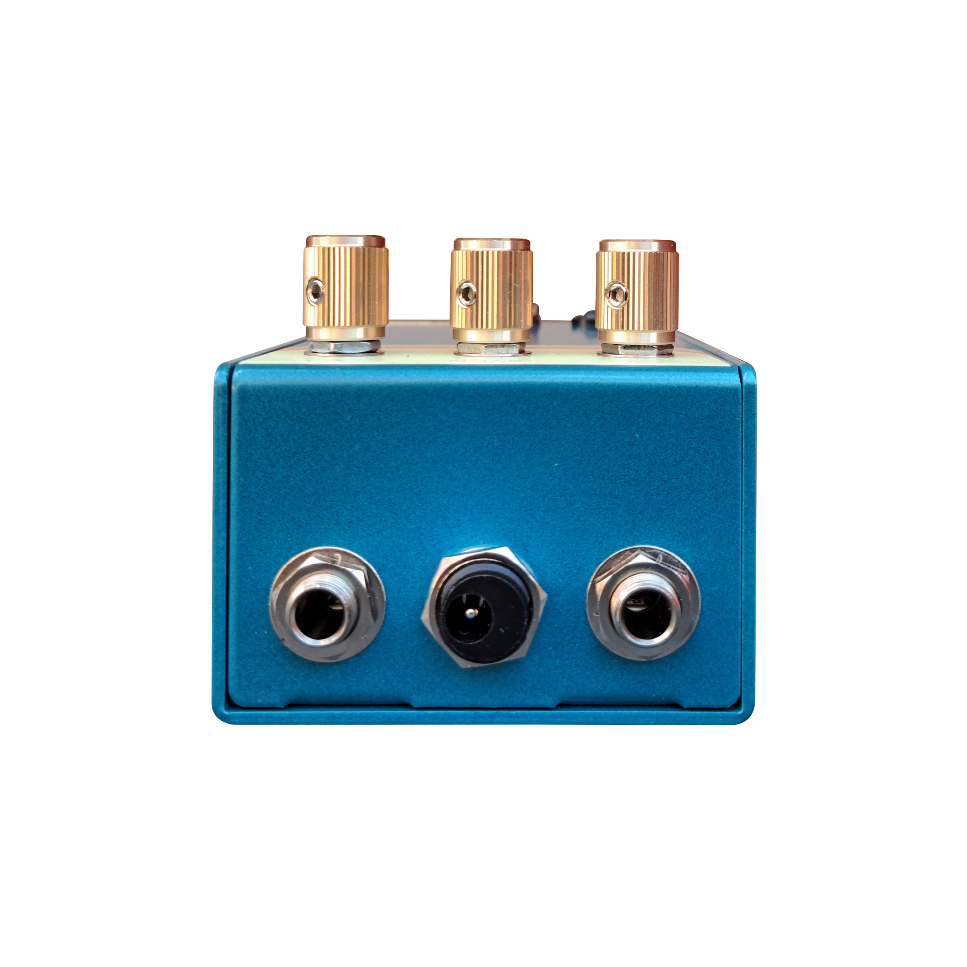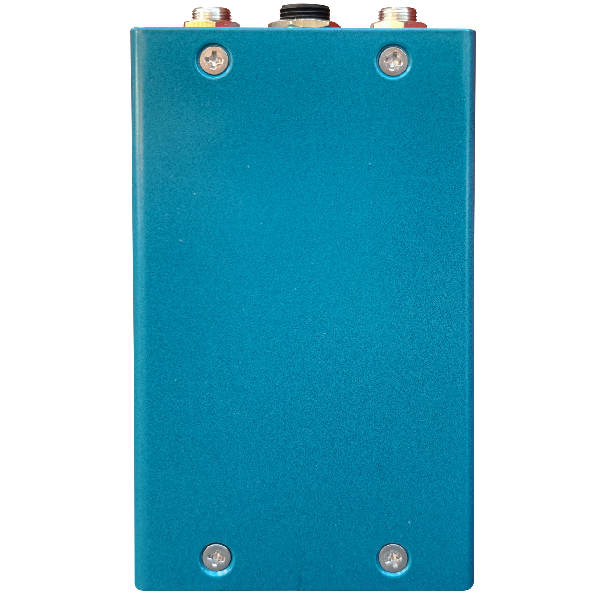 The build is a mix of the old and the new. Carbon film 1/2 watt resistors are paired with Polypropylene film caps for classic tone while making the fuzz feel fast and responsive. The only electrolytic in the audio circuit is a high grade bipolar MUSE cap, while the power caps are the trusty Panasonics. This batch is made using 2N404A transistors, which gives lots of grunt and grit when driven but are tasty and warm at low gain. Powder coat is a metallic teal with retro colored graphics on a custom folded aluminum chassis.