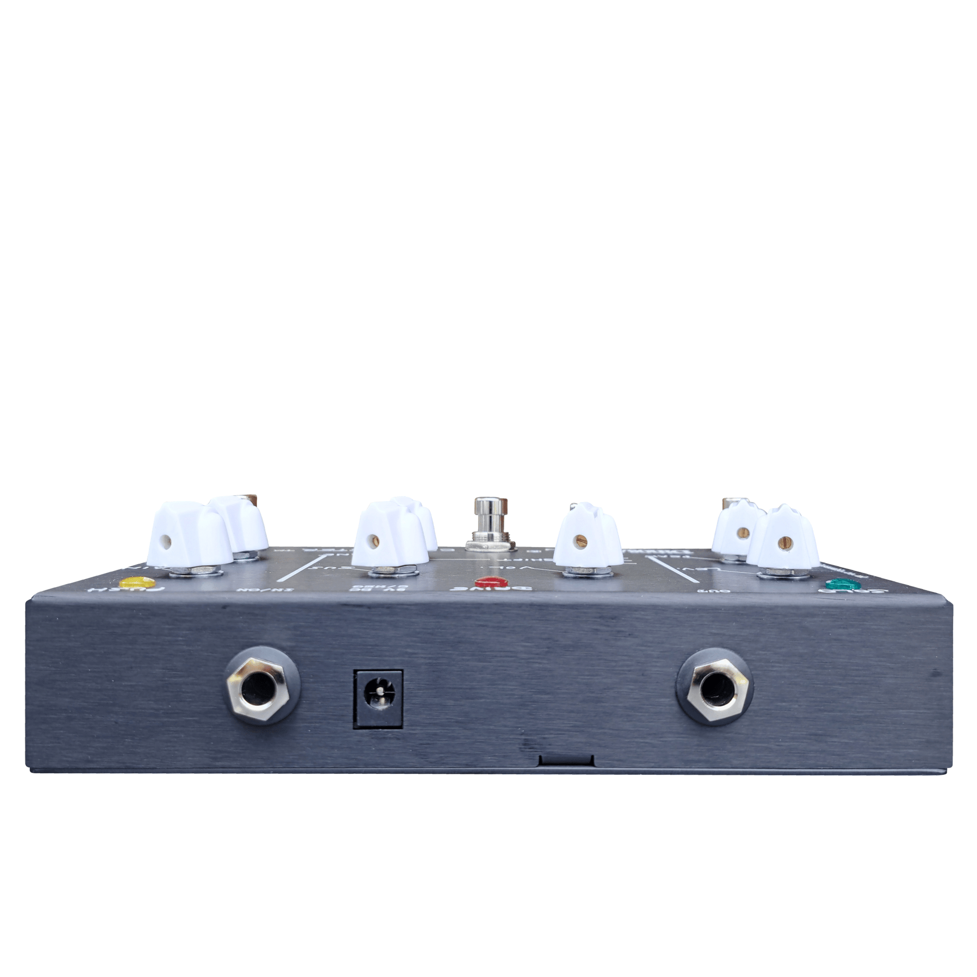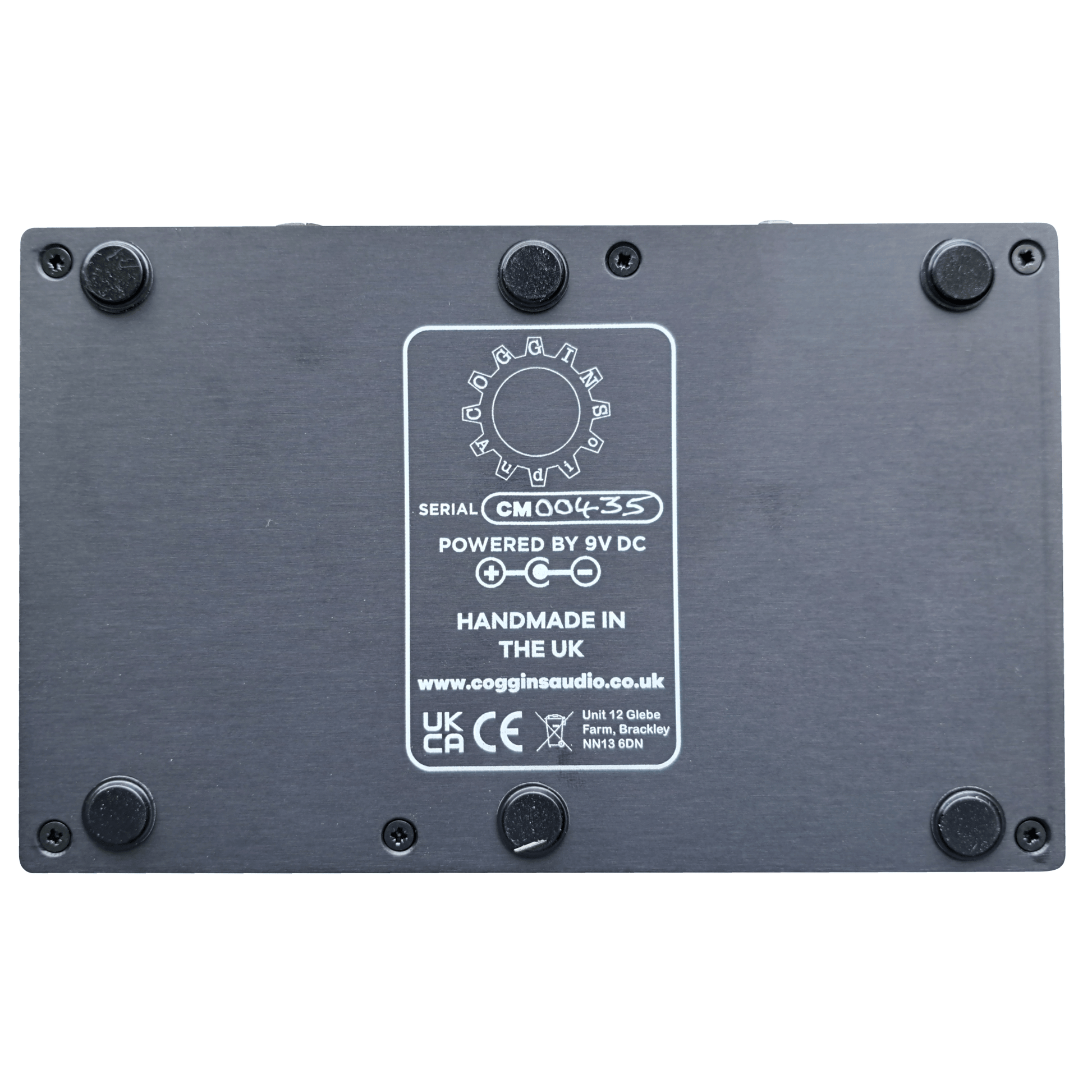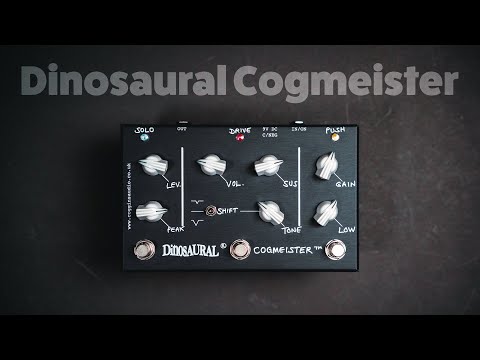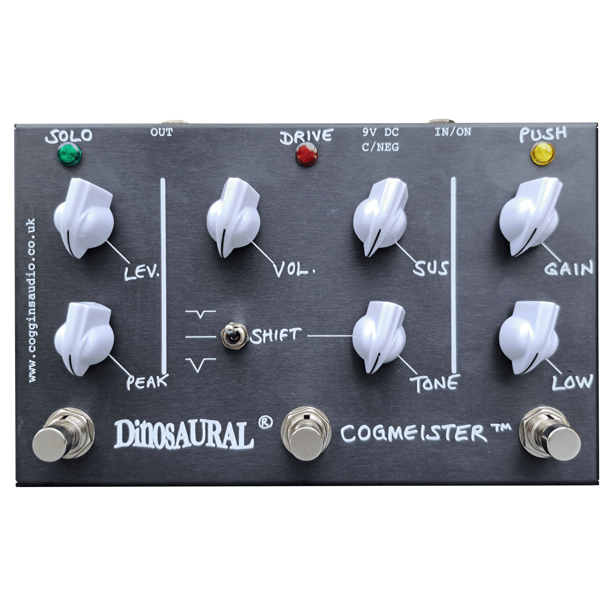 The Cogmeister is a single guitar booster / overdrive / distortion / fuzz pedal containing a trio of compatible sections arranged in fixed series pattern; these comprise the Push, Drive, and Solo sections – each featuring its own true/hard-wire bypass stompswitch and corresponding LED.
