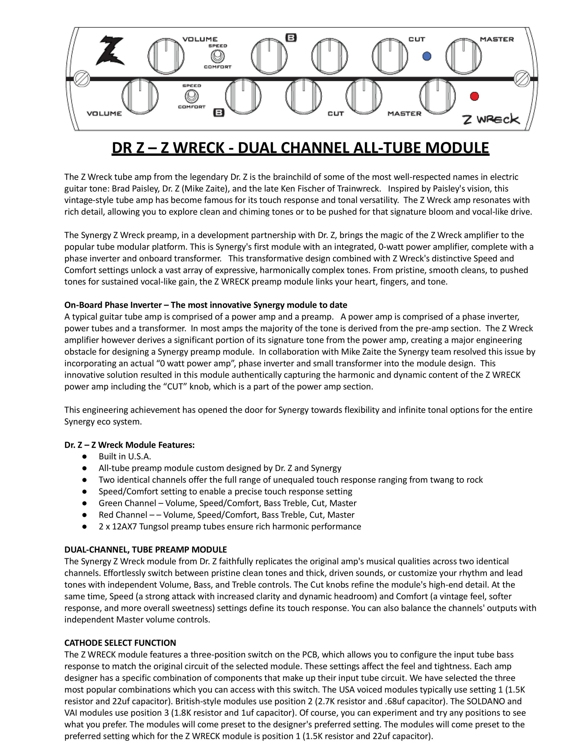 A typical guitar tube amp is comprised of a power amp and a preamp. A power amp is comprised of a phase inverter, power tubes and a transformer. In most amps the majority of the tone is derived from the pre-amp section. The Z Wreck amplifier however derives a significant portion of its signature tone from the power amp, creating a major engineering obstacle for designing a Synergy preamp module. In collaboration with Mike Zaite the Synergy team resolved this issue by incorporating an actual “0 watt power amp”, phase inverter and small transformer into the module design. This innovative solution resulted in this module authentically capturing the harmonic and dynamic content of the Z WRECK power amp including the “CUT” knob, which is a part of the power amp section.