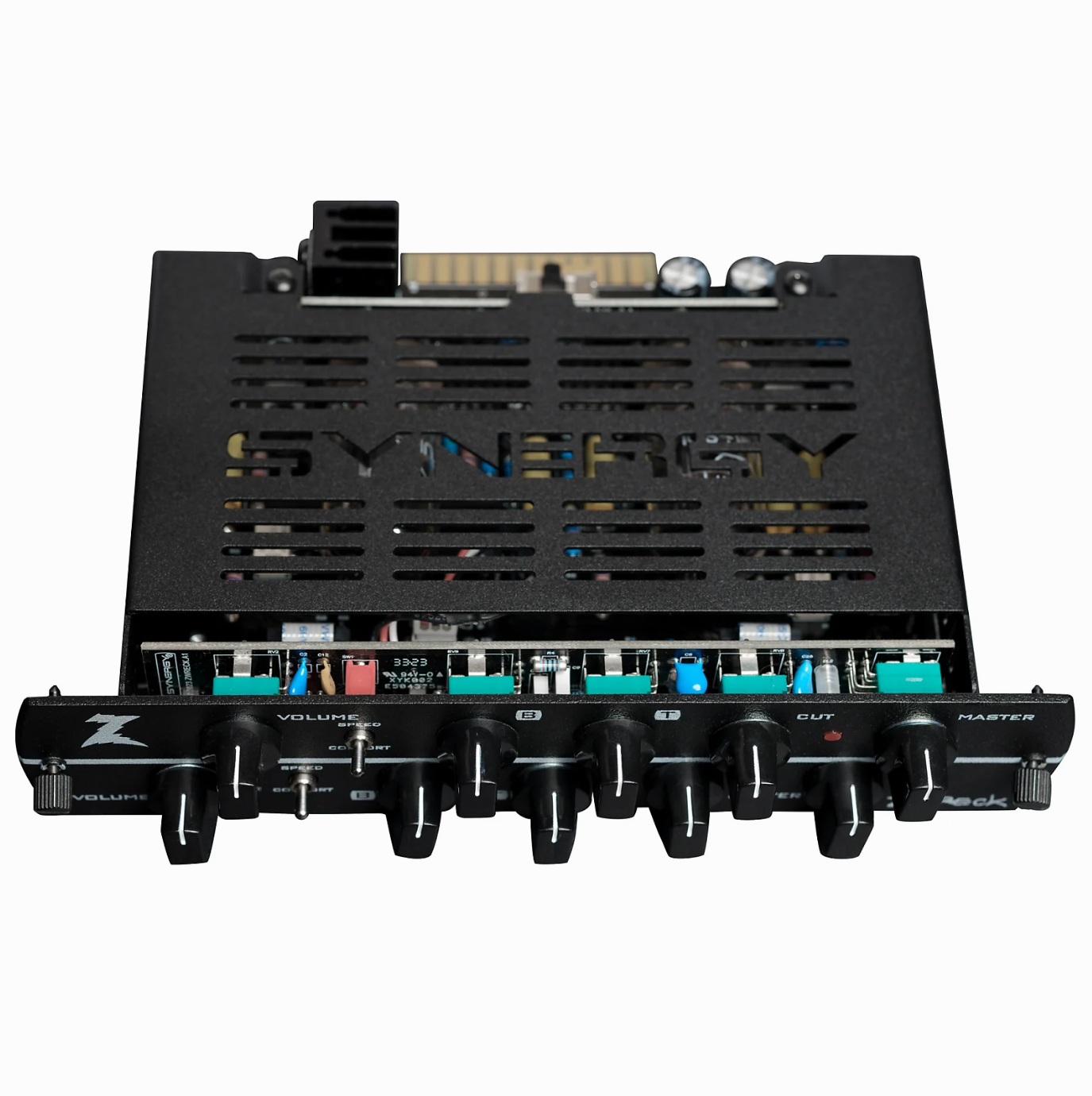 Never ones to ignore a classic design, Synergy reached out to the Engl Amp designer of the Powerball head, Horst Langer to provide us with the amp’s signature swath of tones in an all-tube Synergy preamp module. The Synergy Powerball module boasts two of the amps four channels with enough control on tap to go toe to toe with the namesake head. Not only will you find the standard 3-band EQ, gain, and volume controls, but two Gain Lo/Hi and Mid Boost switches per channel put a world of these German-engineered tones at your fingertips.