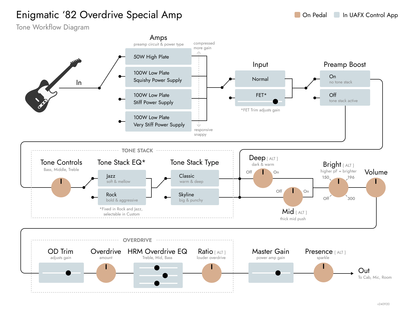 Universal Audio wore out the rolodex to get exclusive access to numerous original Overdrive Special amps, spanning three essential eras of these mythical tone monsters. From the 1970’s Santa Cruz models that brought the ODS into the light, to later LA iterations in the ‘80s and ‘90s used on countless legendary sessions, Enigmatic ‘82 puts the sound of these fabled amps under your fingertips. Looking for that rare tone that’s entirely your own? Flip Enigmatic ‘82 into Custom mode and go under the hood to design your own unique ODS voice in the UAFX mobile app. Mix and match different amp modifications, from the FET preamp and HRM overdrive voicings, right down to the late ’80s Skyliner tone stack option, output tube bias and power supply stiffness, and more. A hallmark of the original amps, Enigmatic '82's Jazz and Rock modes let you enjoy shimmery cloud-like cleans to creamy overdrive that blooms with dynamics. Whether you favor intricate chord work or expressive lead playing, you’ll instantly find the classic ODS sound that responds to every nuance of your touch and preserves note clarity when overdriven. Enigmatic '82 offers three handpicked mic and speaker combinations, along with six bonus cabs, immaculately captured with UA’s exclusive Dynamic Speaker Modeling.