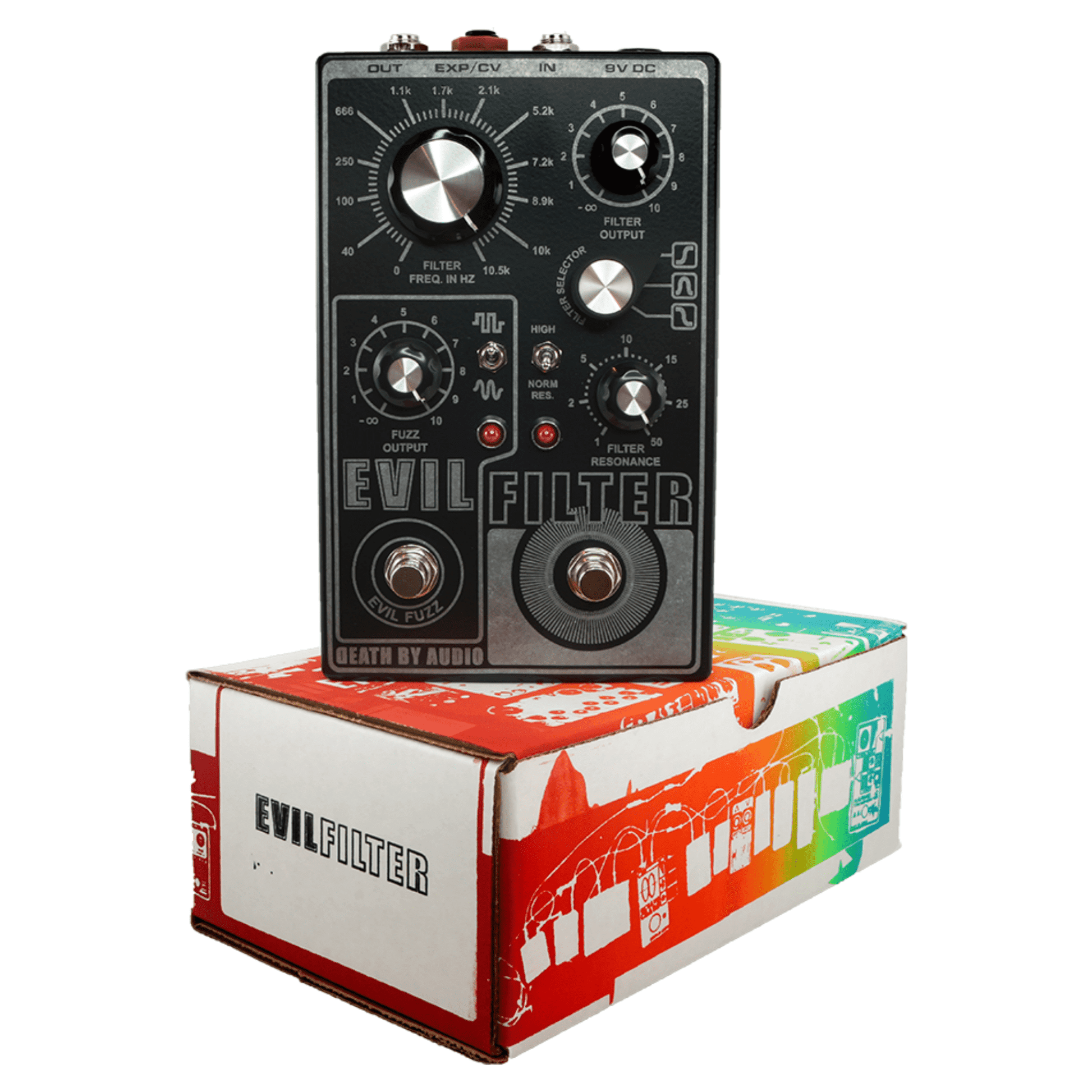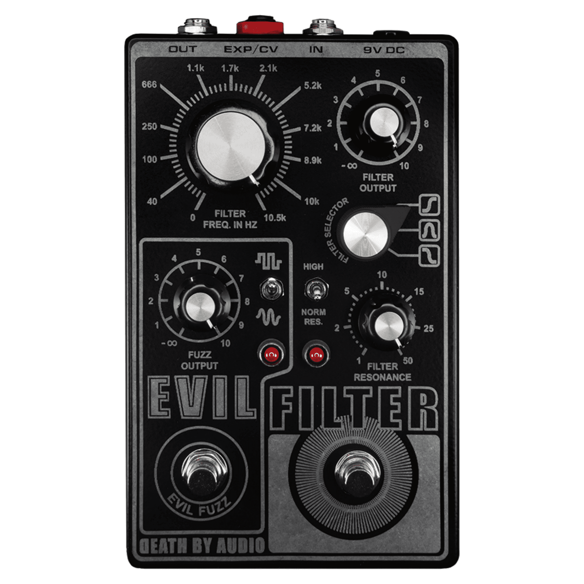 Psycho multimode filter with an ultra-sleek, laser-etched enclosure. Its medical-grade IC chip creates a hyper-precise filter that sounds like no other. With high pass, bandpass, and low pass modes, as well as two types of screaming resonance, the Evil Filter is ready to saw any sound into pieces - or just be the most insane wah you've ever heard. The Evil Filter's two fuzzes take signals into a much more twisted dimension, creating a blooming compression that's perfect for ripping solos and walls of noise alike. Push it past the limit into octaves up, down, and snarling wavefolding sounds. Using the CV/Expression input, you can also control the filter cutoff frequency with an expression pedal or synthesizer.