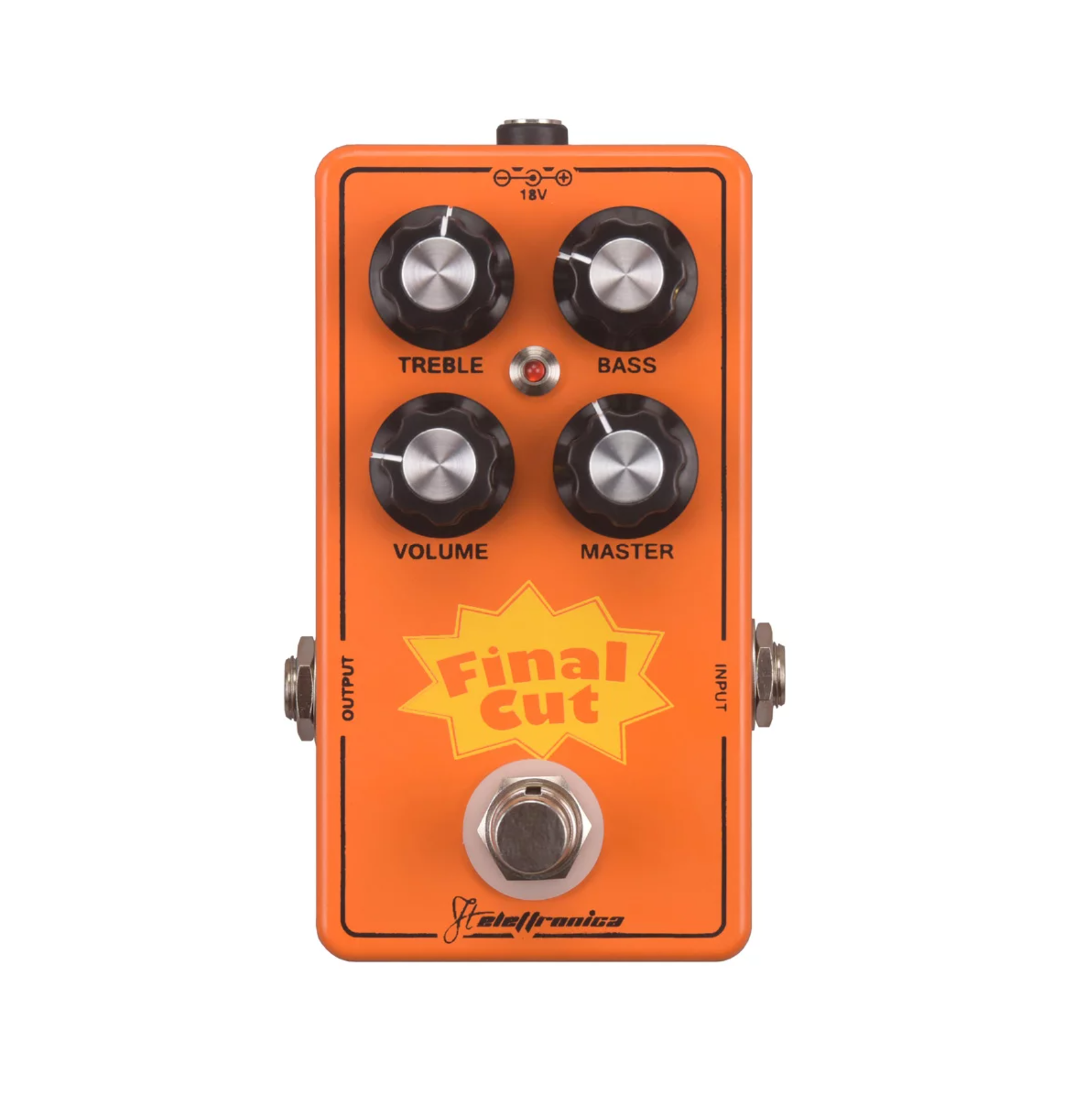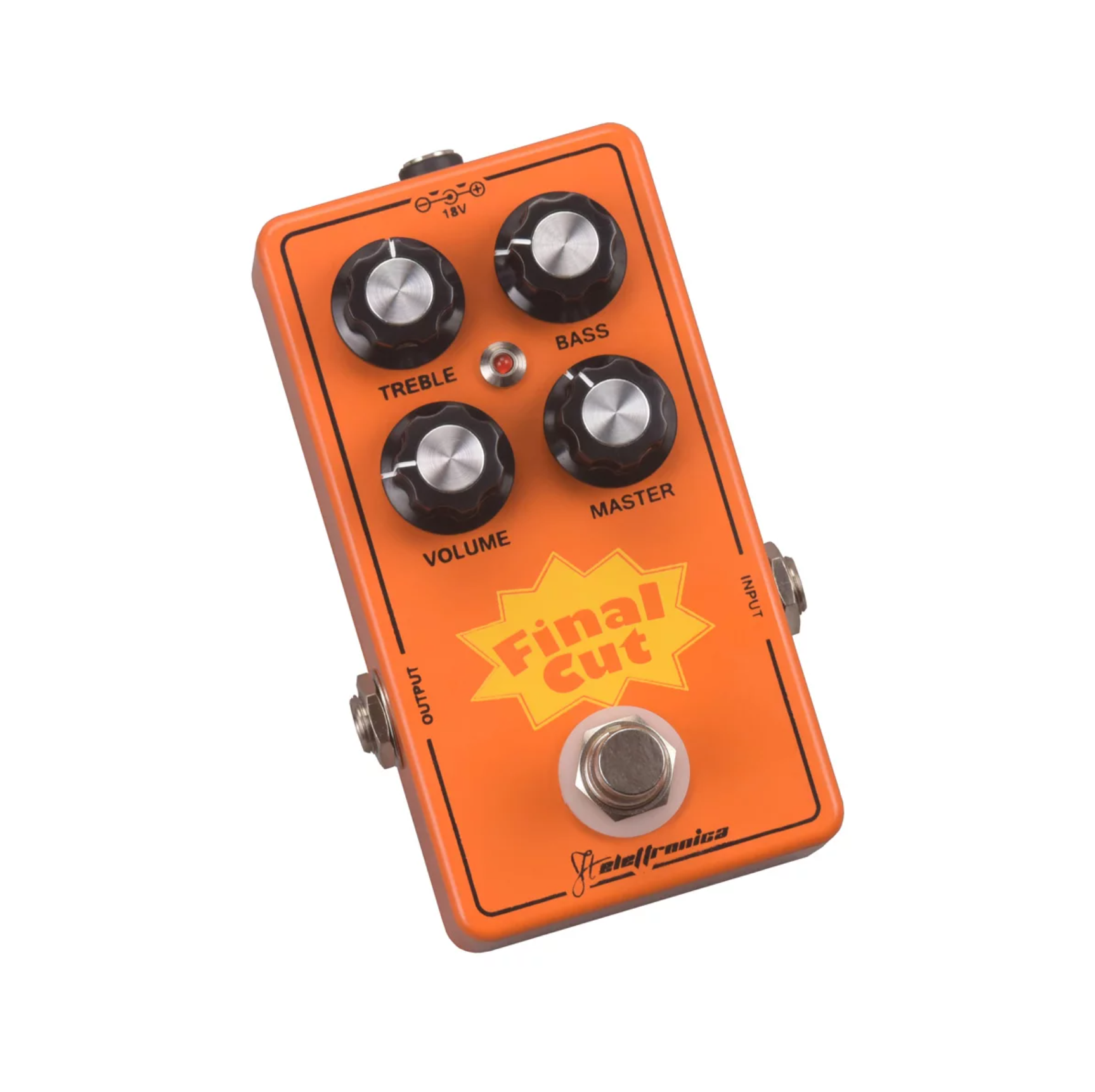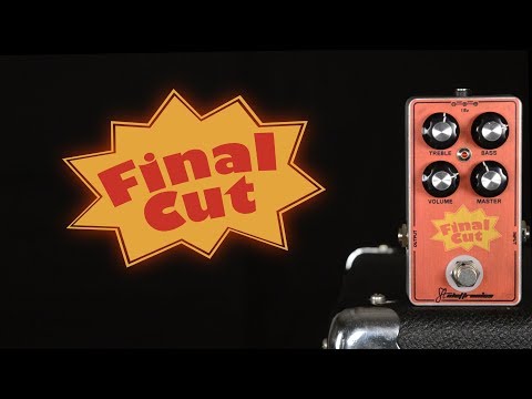 Based on the classic Colorsound Power Boost (a favorite of Jeff Beck and David Gilmour, to name a few), the Final Cut is a transistor-based boost/drive pedal with a 2-band tonestack. This basic but uber-effective control panel provides a wide range of preamp, overdriven and even fuzz sounds to delve into, pushing any rig into the sweet spots of volume boost, edge of breakup and beyond. The Treble and Bass knobs control the high-end and low-end response of the circuit, respectively, while the Volume parameter lets you set the amount of gain coming from the first transistor stage. A Master knob adjusts the overall output volume of the effect, of which there is PLENTY to work with.