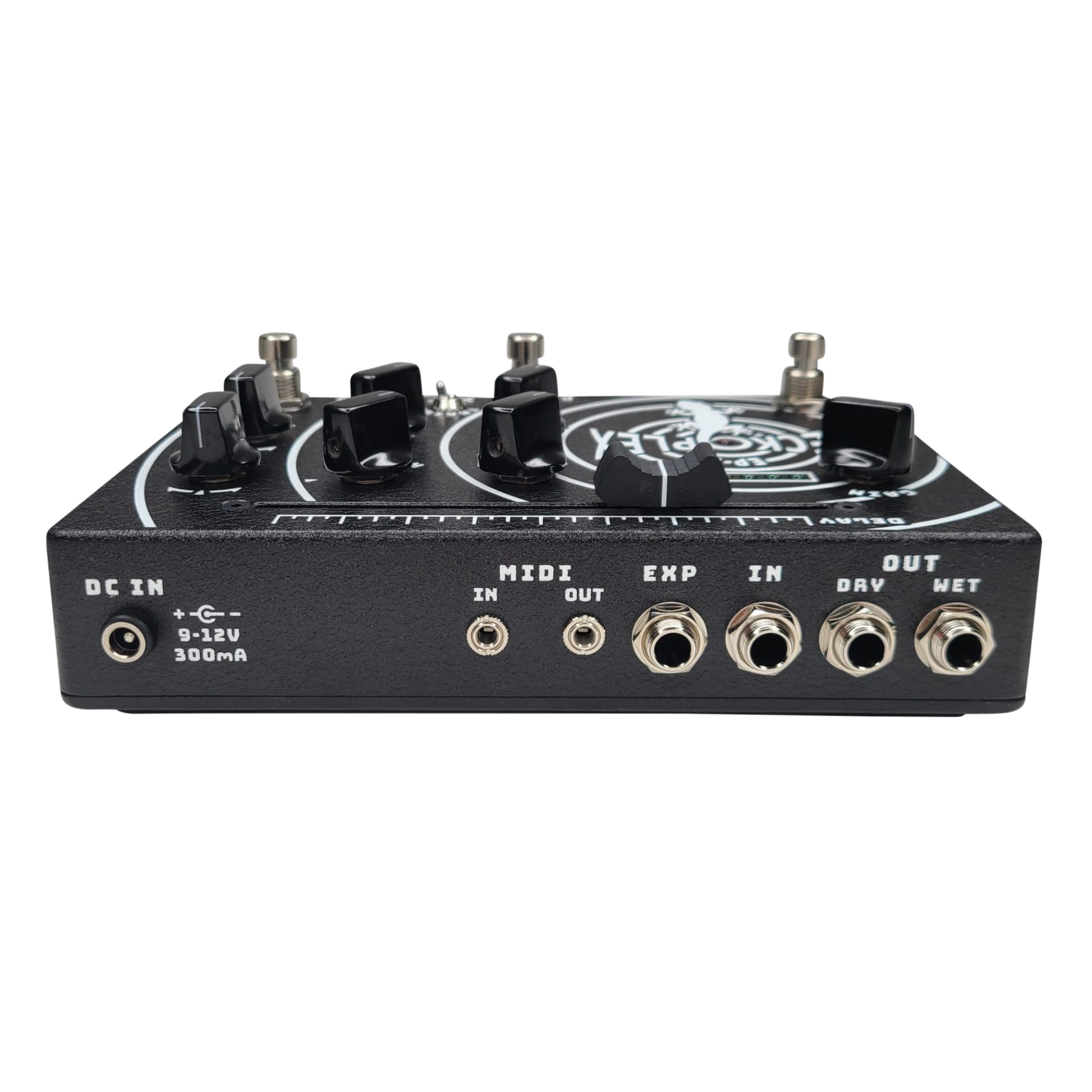 - Motorized delay slide control to set the delay time, similar to a tape write head position lever found on some vintage tape delay units.