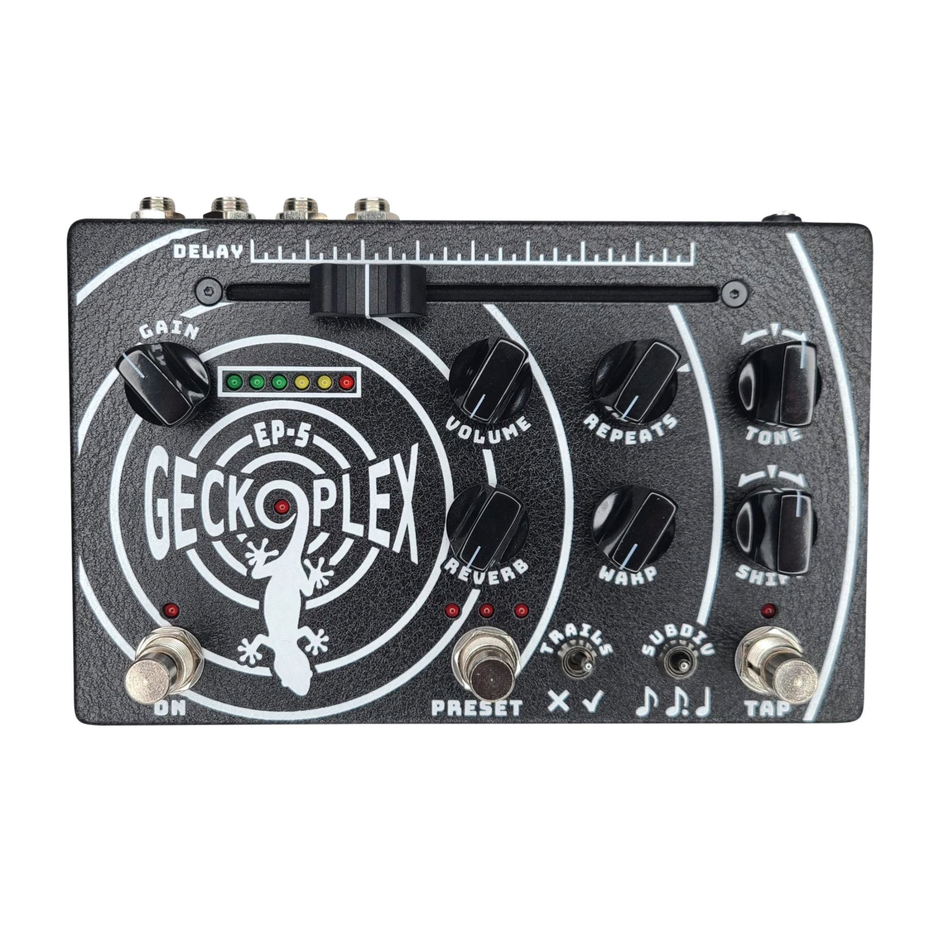 - 6 effect control knobs: echo VOLUME, REPEATS, TONE, WARP, REVERB, and a Gecko Pedals original effect: SHIFT.
