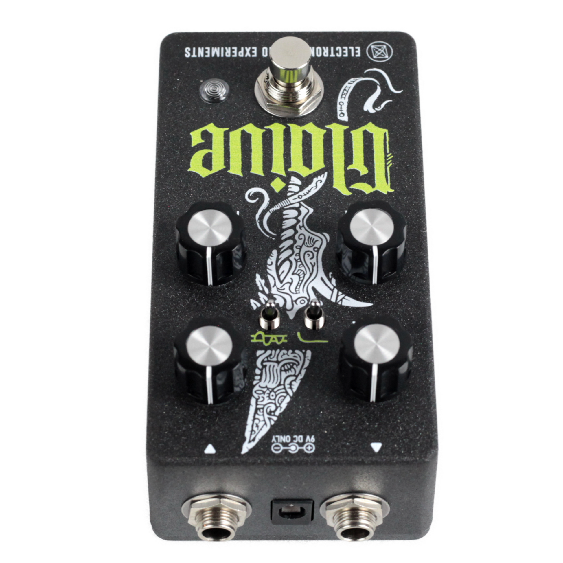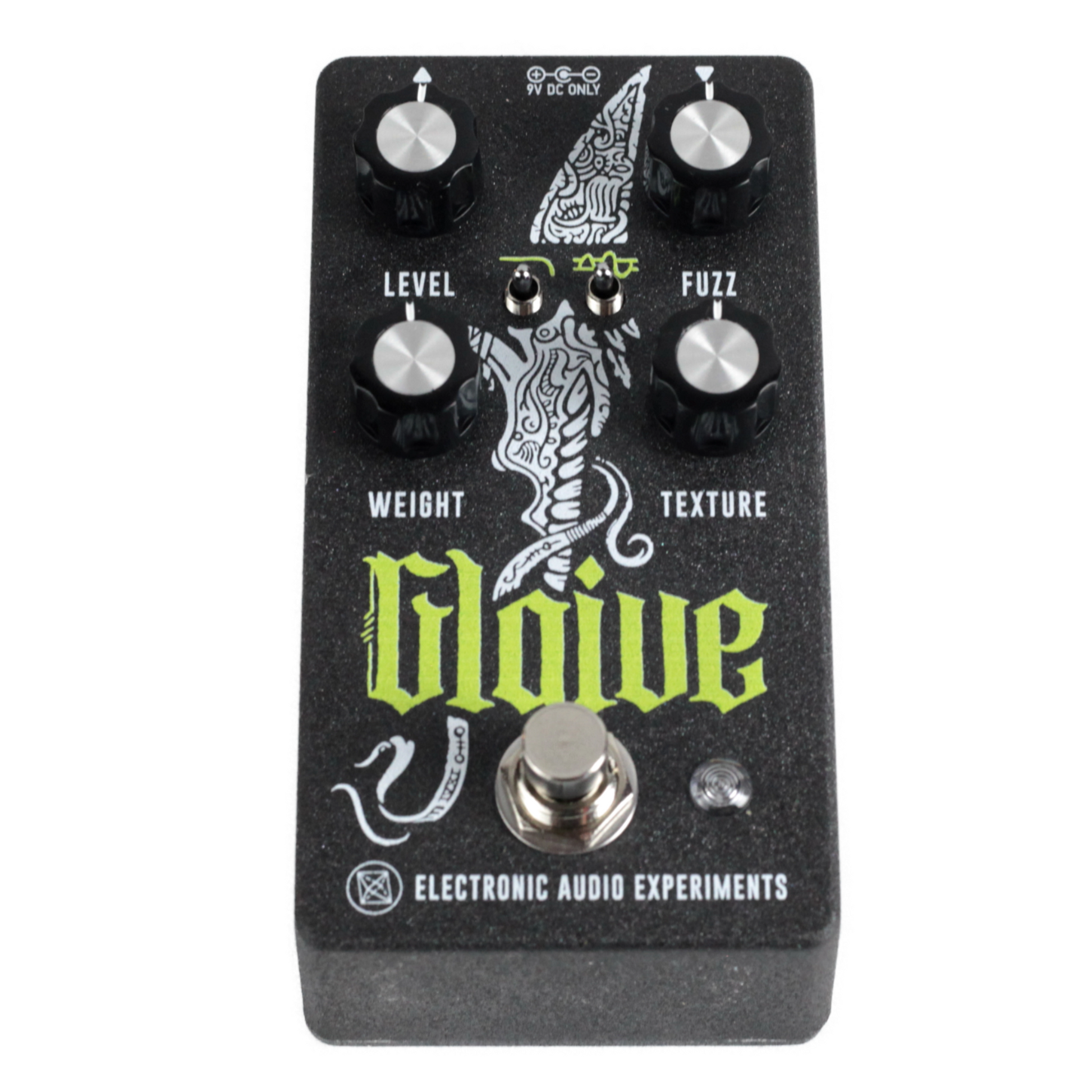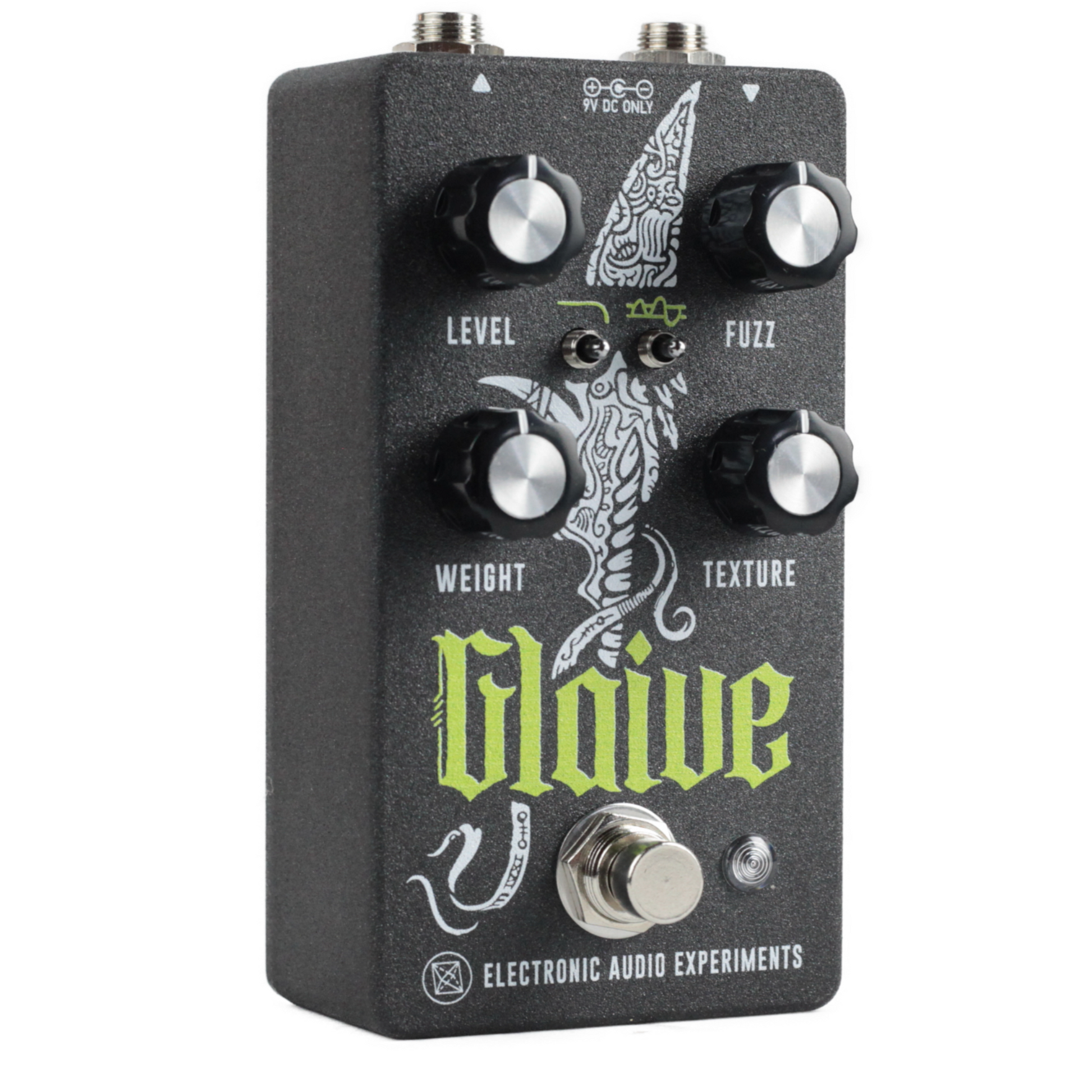 The Electronic Audio Experiments Glaive is the most dangerous gain device in our lineup. This discordant yet deceptively versatile op amp fuzz is capable of over +80dB of gain. The Weight knob adjusts a lightly resonant high pass filter at the input, for tones ranging from tight, ripped- speaker grind to bass-rich sludge. Texture blends in a full-wave rectified analog signal, producing an octave up that gets fed into the fuzz input. Use it for subtle scrambling, or to generate piercing intermodulation products and sub-bass artifacts with a synthesizer-like attack. The LPF toggle can focus harsh overtones or unleash a full-spectrum cut through any mix. Finally, the Squelch toggle enables a brute-force, highly effective bias gate that can temper even the most fanatical gain levels and impart a crumbly, ripping quality to the note decay.