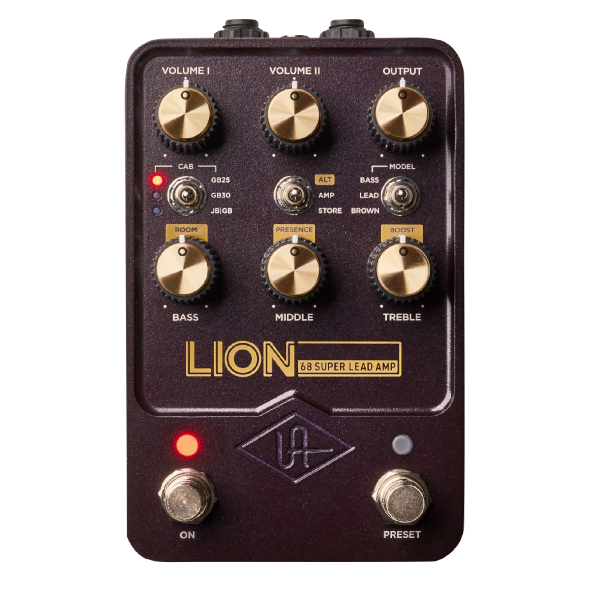 Lion '68 is the only amp-in-a-box pedal that faithfully captures the bell-like cleans, aggressive kerrang, and soaring distortion of a vintage hand-picked Super Lead head, giving you tones that jump from your speakers and electrify your nervous system. Looking for less aggression with a spongier attack and more clean headroom? Lion '68's Super Bass will get you there, with a jaw-dropping emulation of this classic plexi variant — perfect for auditioning overdrives, fuzzes, reverbs, and more. The guitar tone on Van Halen is ground zero for "hot-rodded" Super Lead tones. From the sag of a voltage-starved Super Lead amp to the split Celestion 25-watt "Greenback"/JBL D-120F 4x12 cabinet, you'll get the meaty sizzle, softer attack, and string-to-string definition that inspired generations of guitarists.