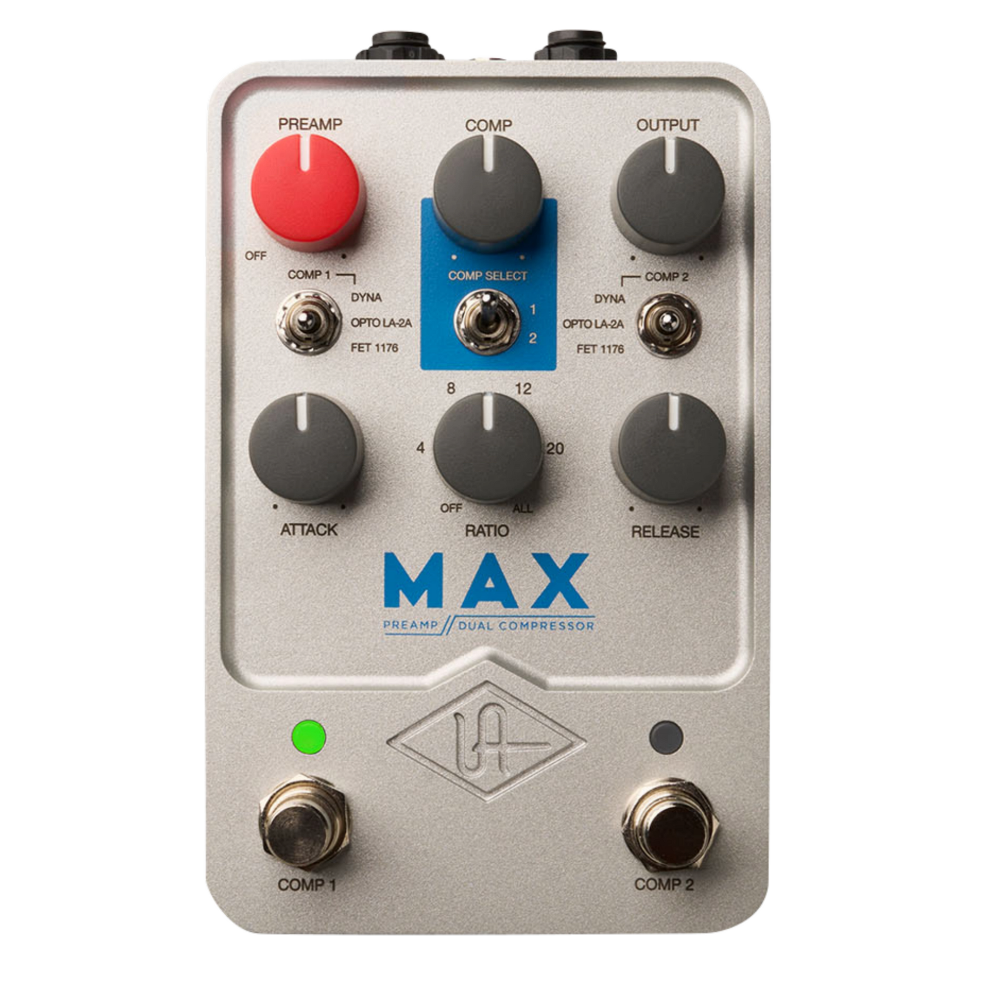 Built upon award-winning UAFX dual-engine processing and a burning desire for the ultimate in sonic legitimacy, Max Preamp & Dual Compressor puts the colorful sound of three legendary limiters and an iconic tube preamp, right at your feet. From the mind of UA founder Bill Putnam to your pedalboard, Max gives you the same FET compressor used on decades of legendary studio guitar sounds, whether you're looking to make your funk a little funkier, add soulful sustain, or inject subtle infusions of tone. This legendary optical tube limiter gives you softer, warmer dynamics control versus the 1176. Plus, you can fine tune your compression with a pedal-exclusive Ratio feature, for limiting beyond the vintage hardware and UAD plug-in versions. Add the grimy squeeze of this (in)famous red box to your sounds for lo-fi compression and funky overdrive — perfect for sleazy slide tones. Get the warm detail and character of UA's iconic tube preamp and EQ, and dial in killer sounds with the perfect amount of harmonics and grit. With Max, you can easily layer compressors in any combination for a dizzying array of sounds and textures, letting you push your tones to the front no matter how much limiting you apply. With the UAFX Control app, you can tweak EQ settings, get serial/parallel operation, and add a sidechain bass filter for fully customized compression and preamp effects.