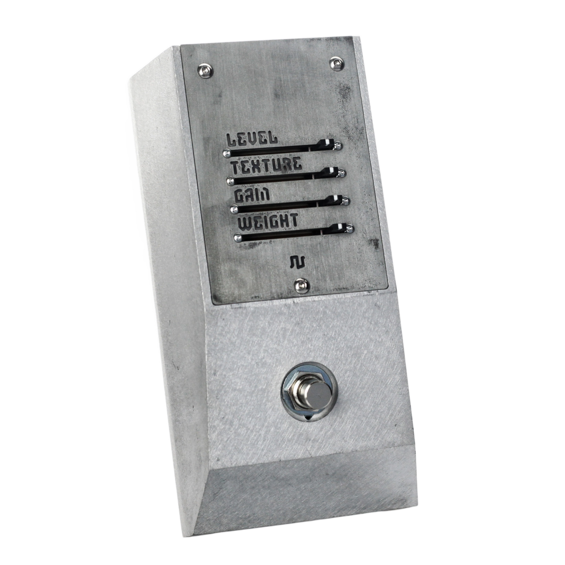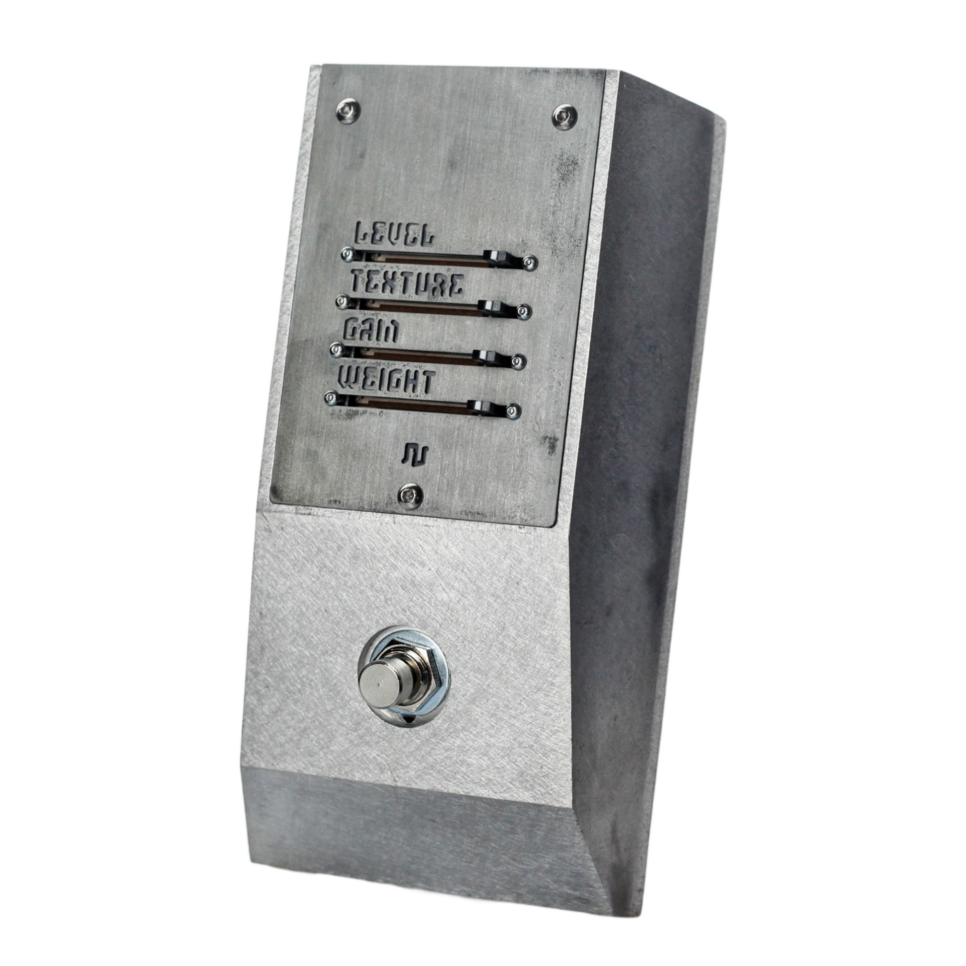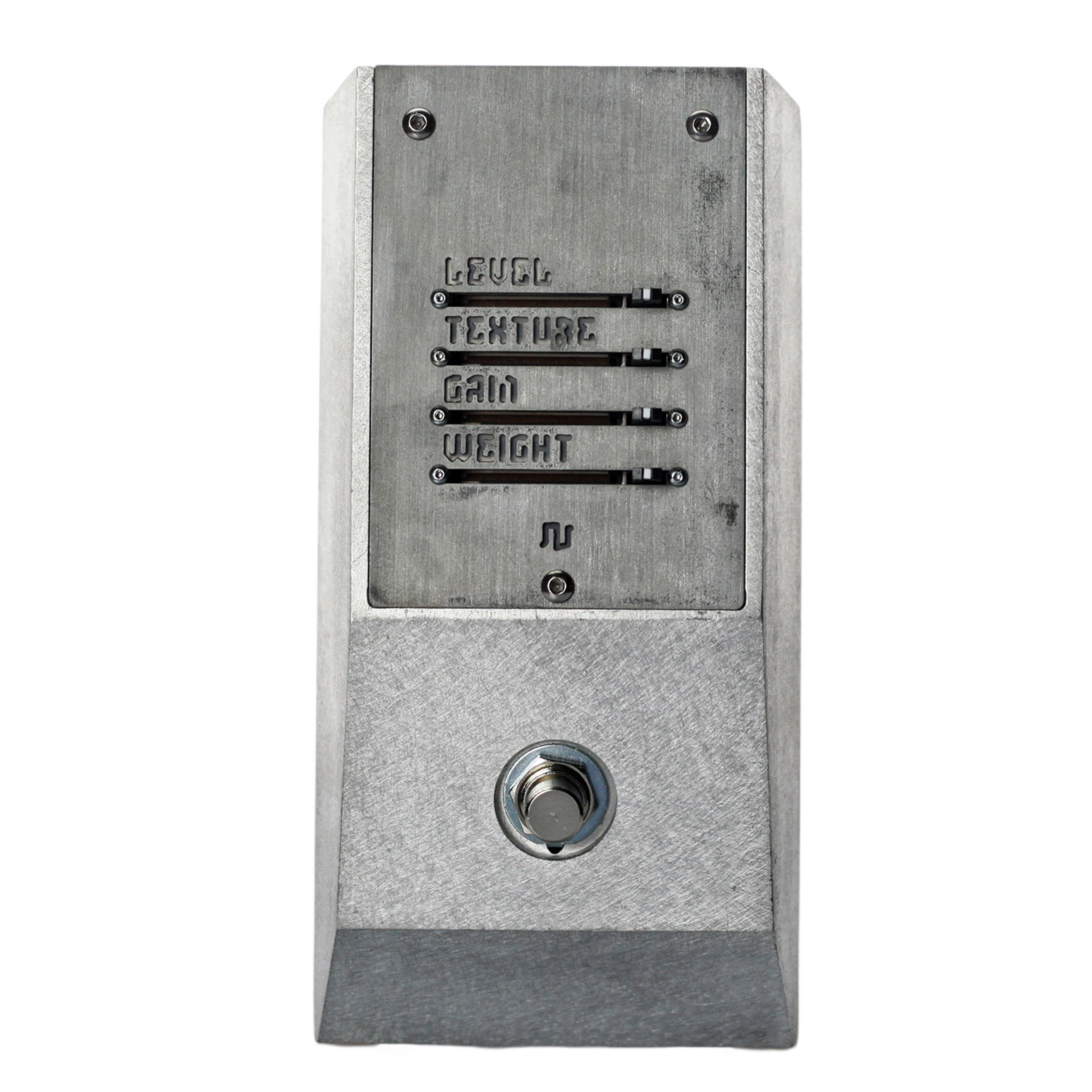 The imposing neo-brutalist geometry houses the auditory equivalent of an angle grinder. There is no subtlety or transparency to be found here. This belligerent yet deceptively versatile op amp fuzz circuit is capable of up to +80dB of gain with a massive volume output. The Weight control adjusts a lightly resonant pre-gain high pass filter, allowing the tone to range from tight, ripped-speaker grind to bass-rich aluminum slag. The Texture control blends in a full-wave rectified analog octave up at the input, creating piercing intermodulation products and sub-bass artifacts with a synthesizer-like attack.