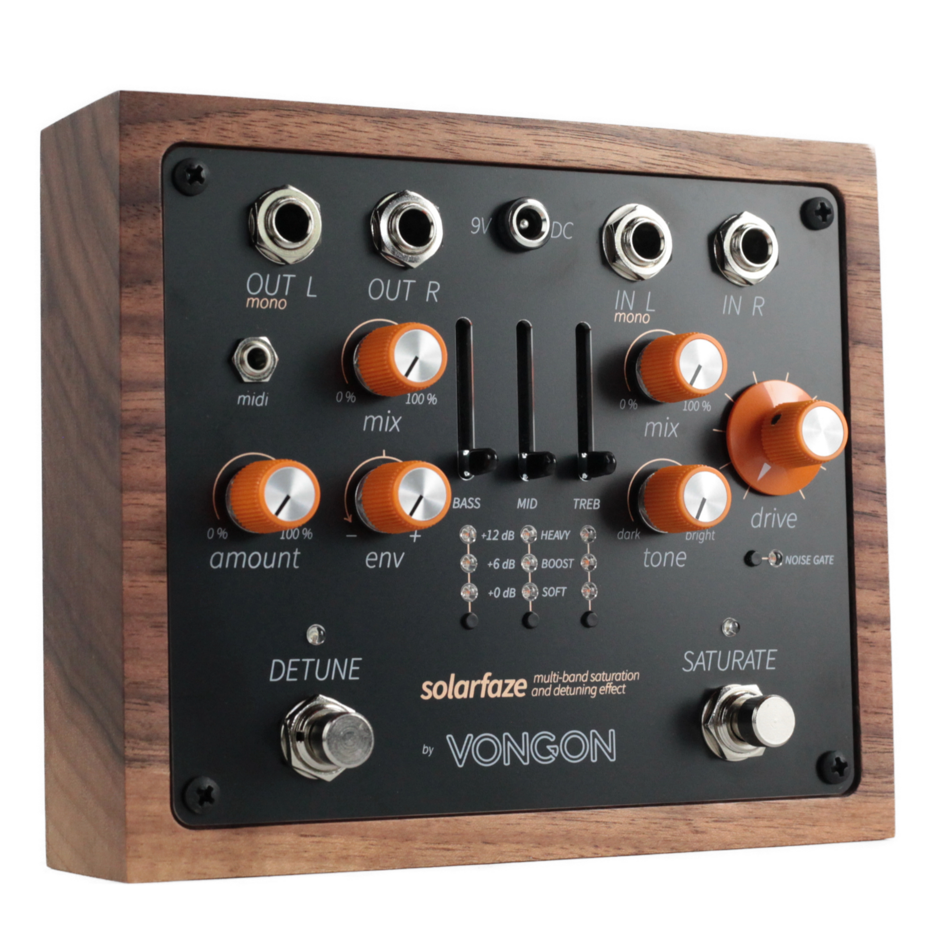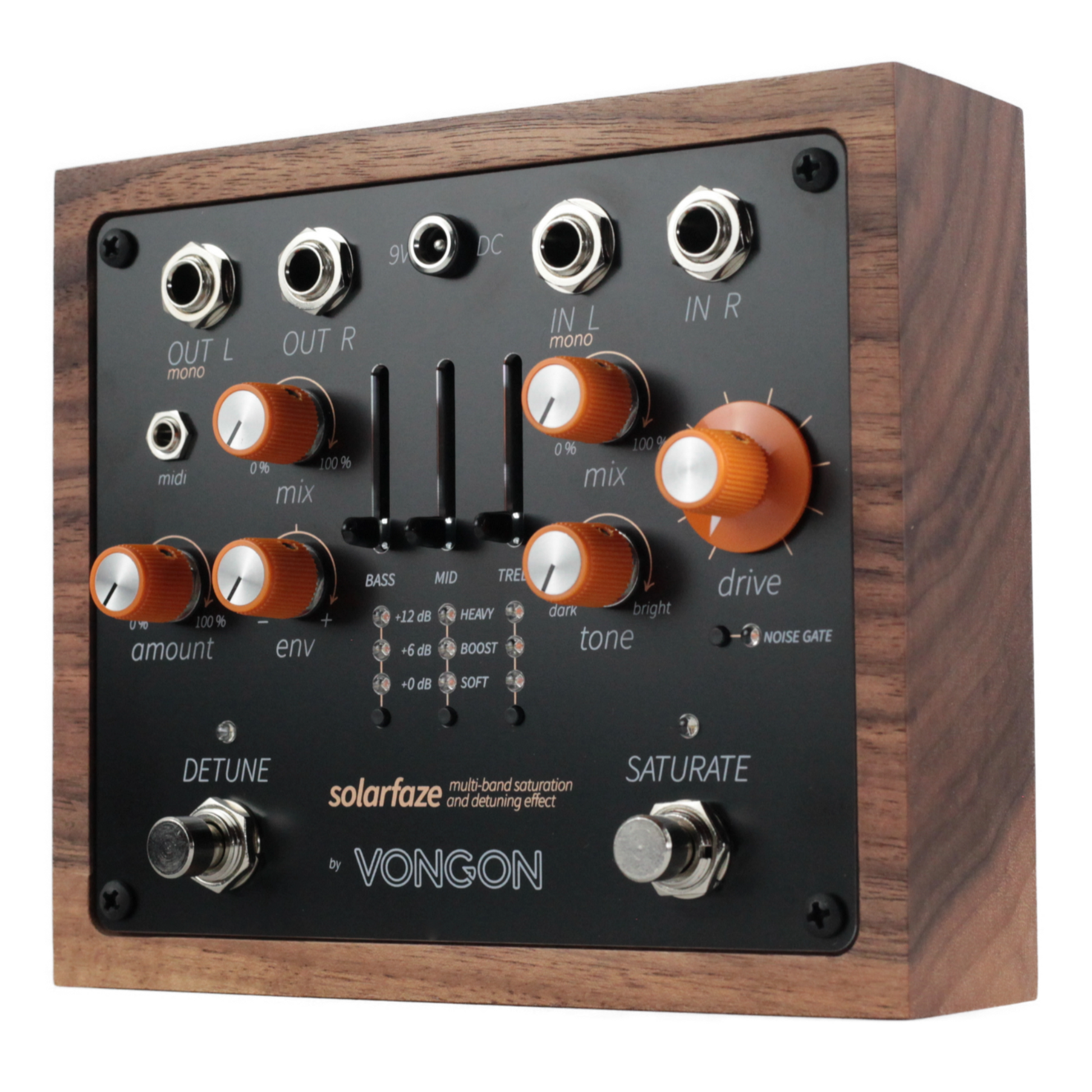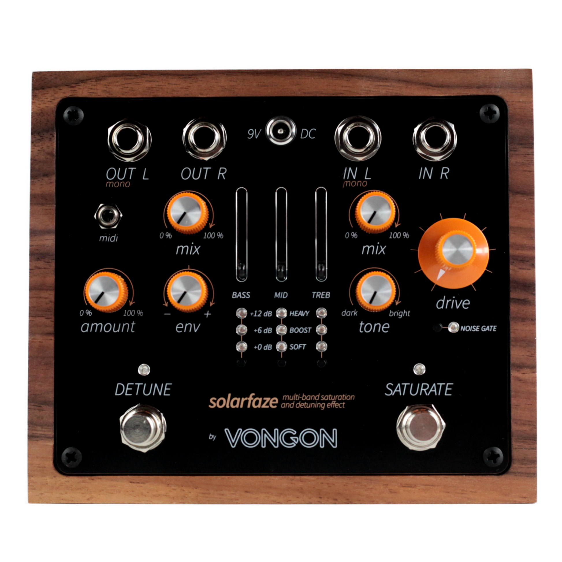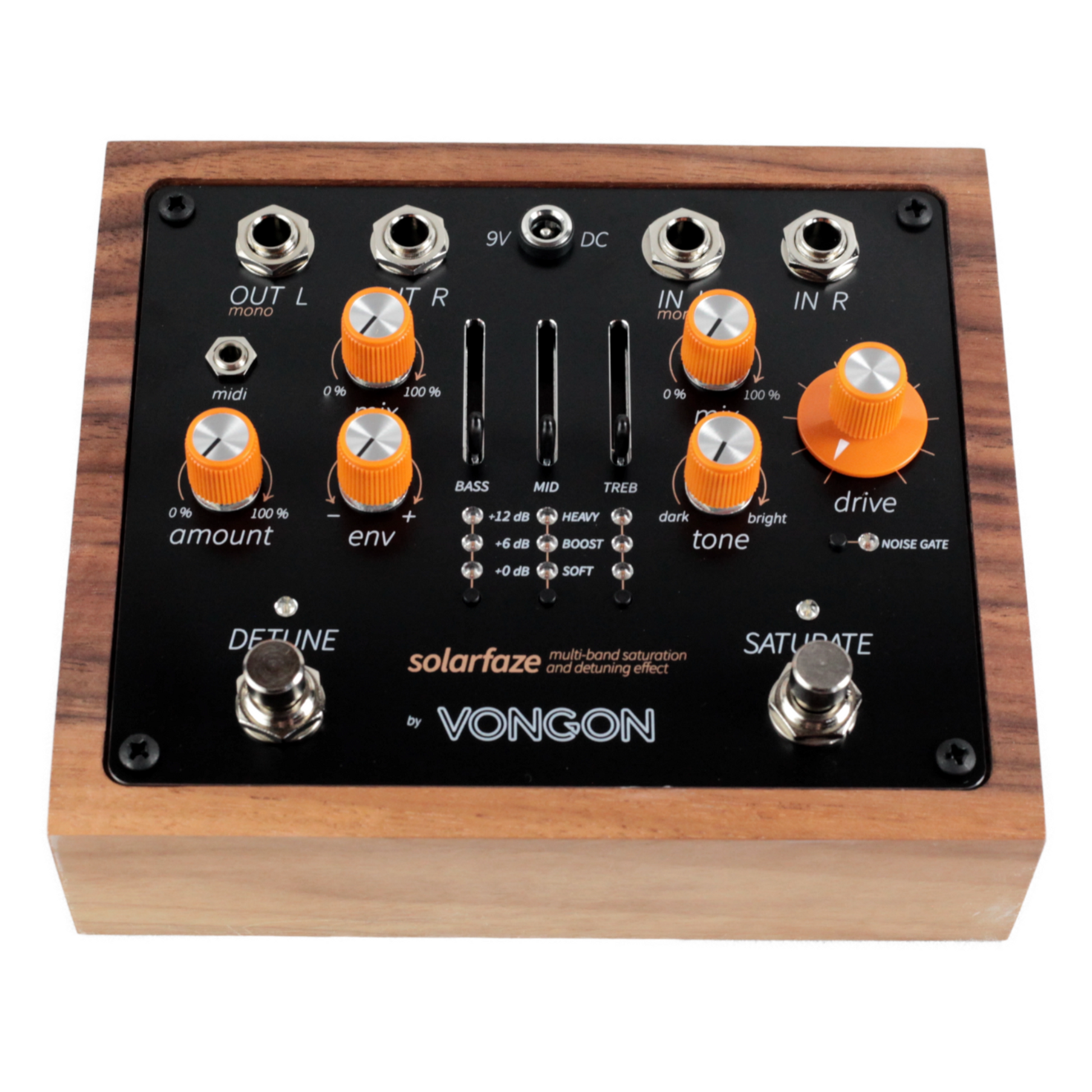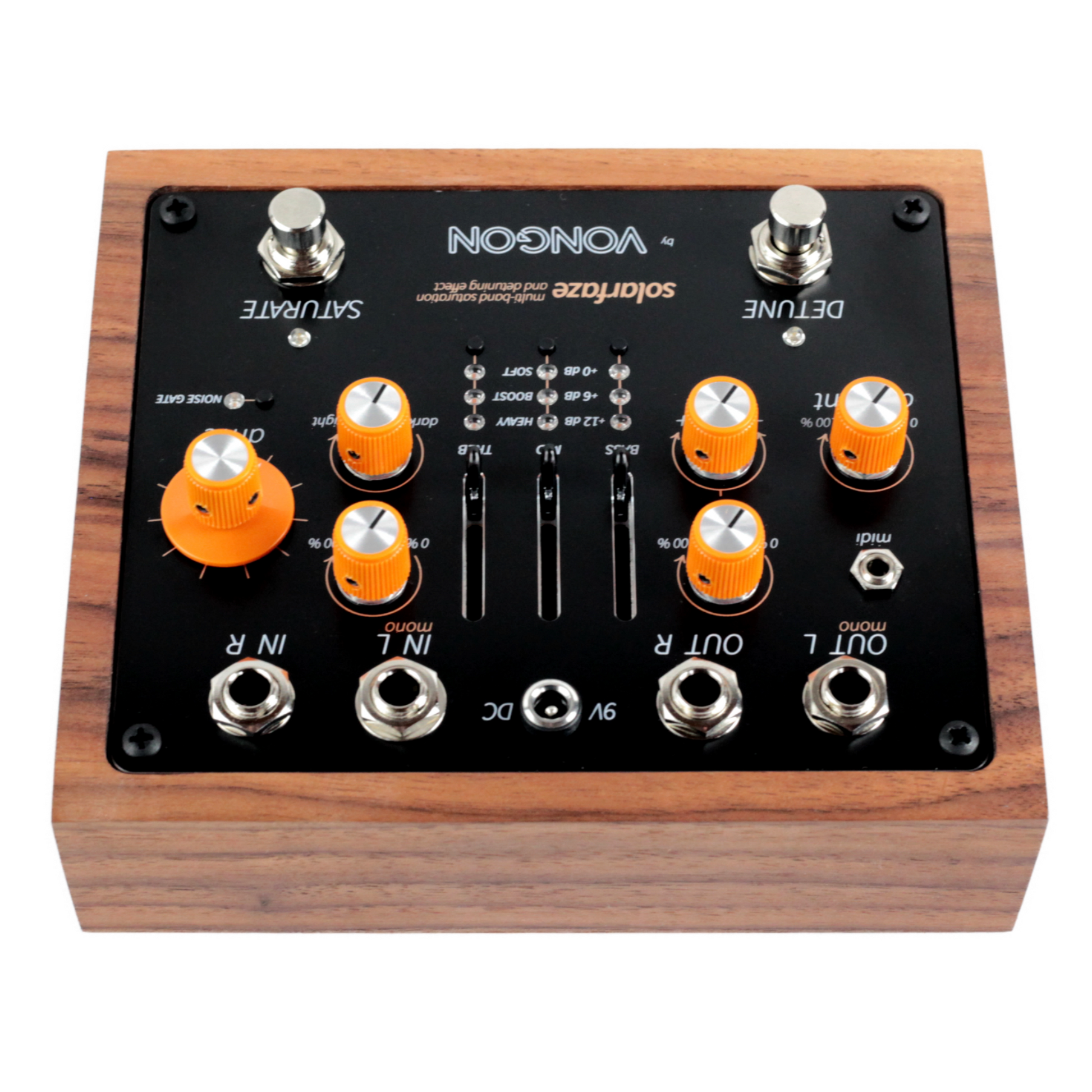Additional features include a built-in NOISE GATE for high-gain settings and flexible effect routing that allows SATURATE to run before DETUNE or vice versa. the pedal supports both analog buffered bypass for zero-latency pass-through and DSP bypass for completely silent effect toggling. MIDI control extends the possibilities further, with nine onboard user preset slots and remote adjustment of every parameter.