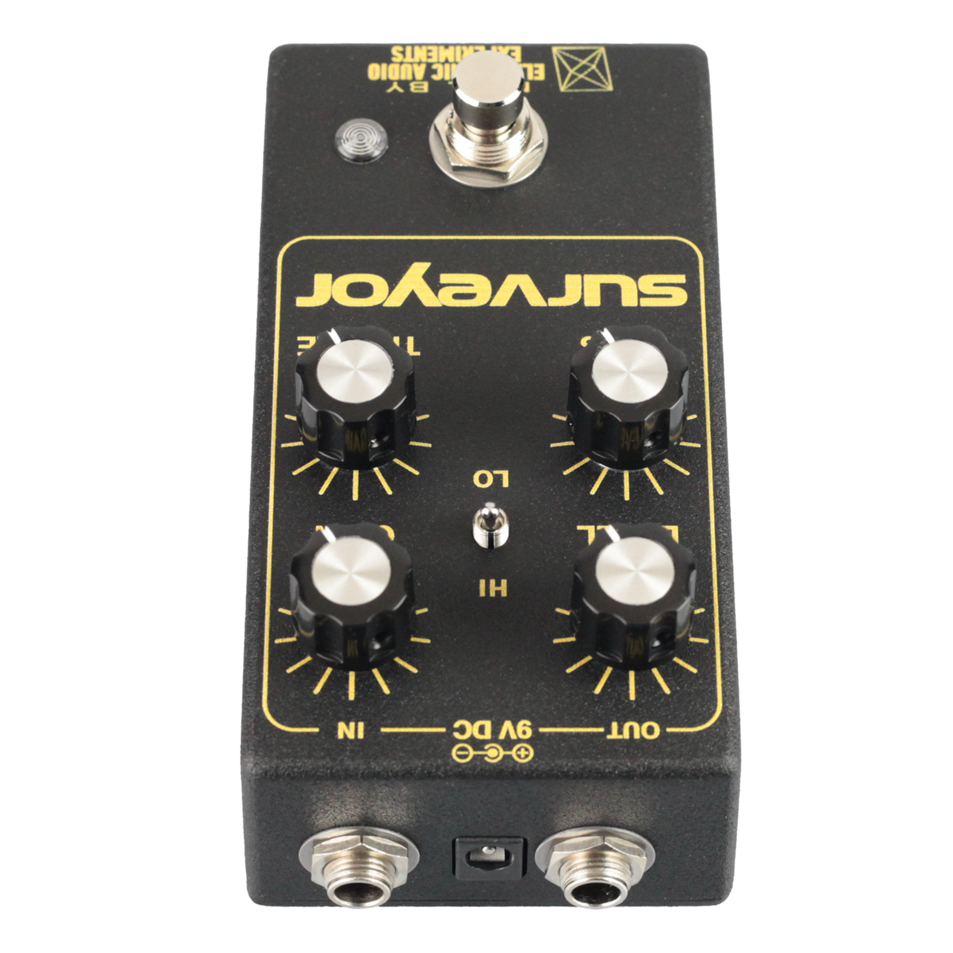 The Surveyor features a unique, transformer-loaded “Tube Voice” distortion generator that is highly responsive to the frequency content of the input signal. This is achieved by placing a two-band shelving EQ before distortion is applied—the complete opposite of most drive pedals. Using this method, gain may be selectively applied to a specific frequency band: boost the treble for that signature clang, or maximize the bass for fuzz overload. This variety of saturated textures isn’t just for guitar, either! The Surveyor is equally at home on bass, synthesizers, drum machines, even vocals.