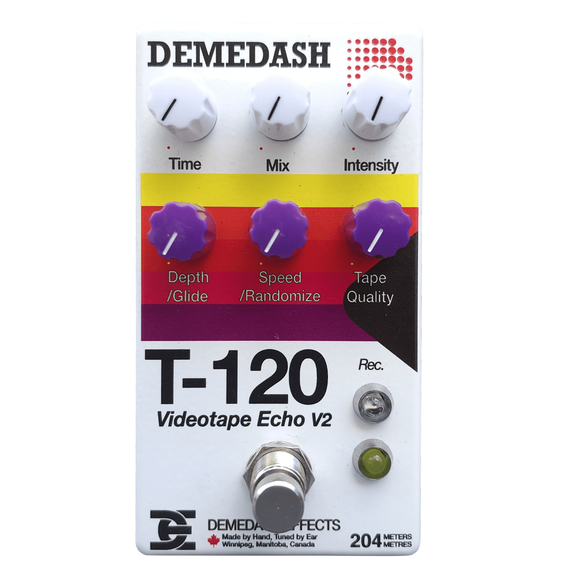The Demedash T120 V2, introduced in June 2020, introduces soft switching and two new LFO parameters - 'Glide' & 'Randomize', accessible by holding the footswitch down while the effect is engaged and turning the 'Depth' & 'Speed' Knobs, respectively.