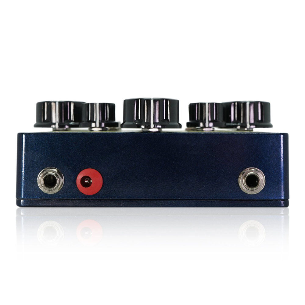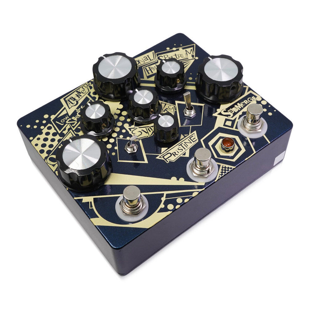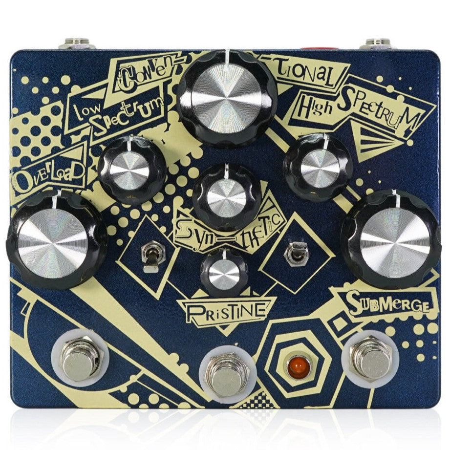 Starting at the top of the pedal, the "Conventional" knob is a traditional sounding fuzz. This is meant to balance out the more chaotic fuzz tones and provides a bread-and-butter sound when you need it. The "Low Spectrum" and "High Spectrum" knobs are part of an active State-Variable Filter, similar to the one found on The Lumen. The "Synthetic" knob is a logic based CMOS fuzz that can be described using the words, velcro-ey, synth-ey, gate-ey, and glitch-ey. The "Pristine" knob allows you to blend in your clean signal when you need a bit of pureness to balance out the crazier sounds. On the left is the "Overload" knob. This controls the amount of signal let back through an internal feedback loop. The output of the fuzz is fed back into the input causing self-oscillation and some gnarly textures. Underneath the knob is a dedicated momentary footswitch to activate the feedback loop or you can latch the feedback loop ON by flipping the toggle switch up. On the right is the "Submerge" knob. This is a monophonic sub-octave fuzz. Similar to the "Synthetic" fuzz, this is also CMOS-based, so similar gated, unstable tones. The "Submerge" also has a dedicated momentary footswitch to add in the sub-octave with its own toggle switch that can latch the sub-octave.