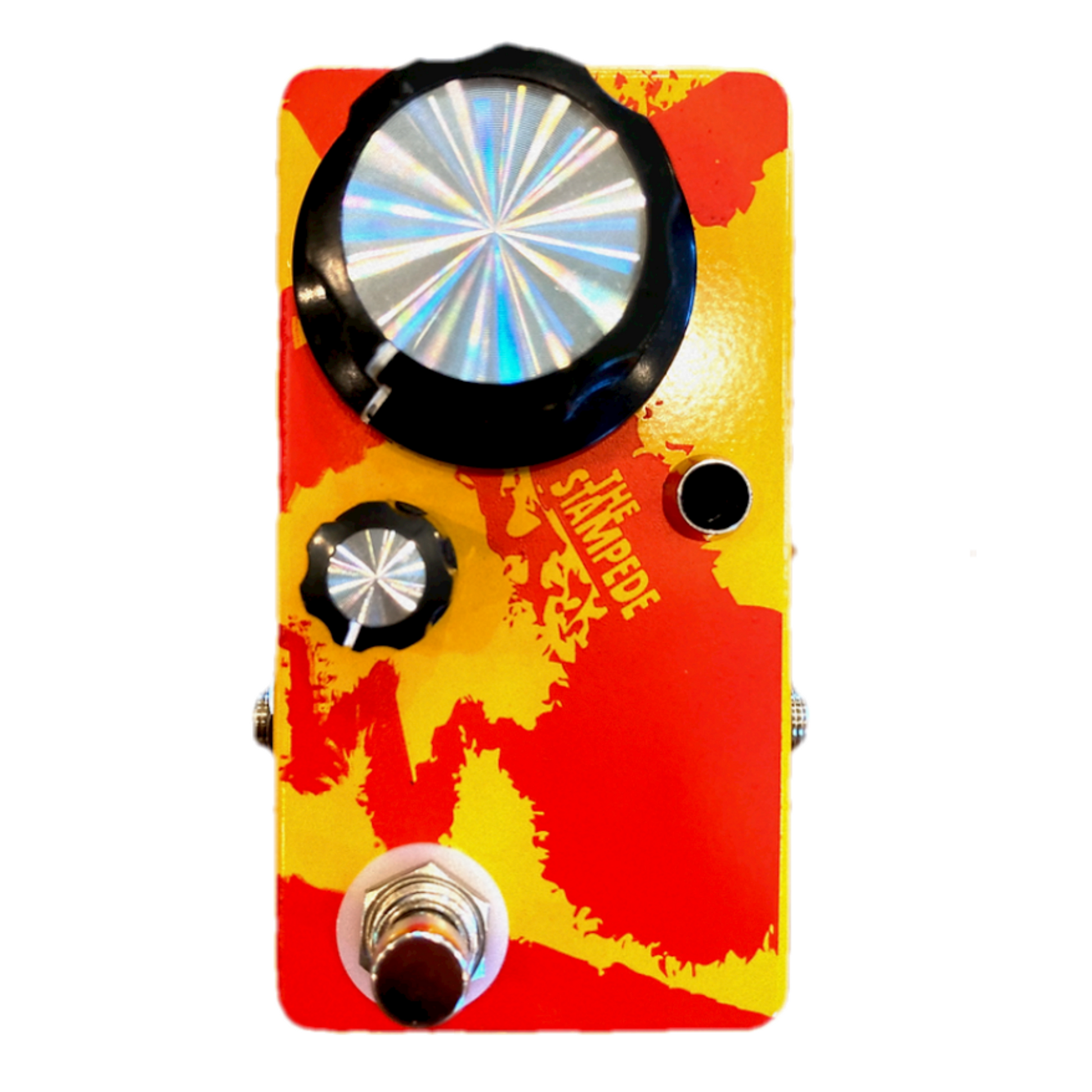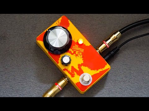 runs off a 4069 CMOS chip for chaotic, synth-esque, fuzz tones.  CMOS fuzzes work by taking your signal and transforming it into a square wave which makes it sound like a synth.  To liven things up a bit, "The Stampede" has a fixed 3-band active EQ with the Low Pass and High Pass running hot and the Band Pass subtly scooping out the midrange.