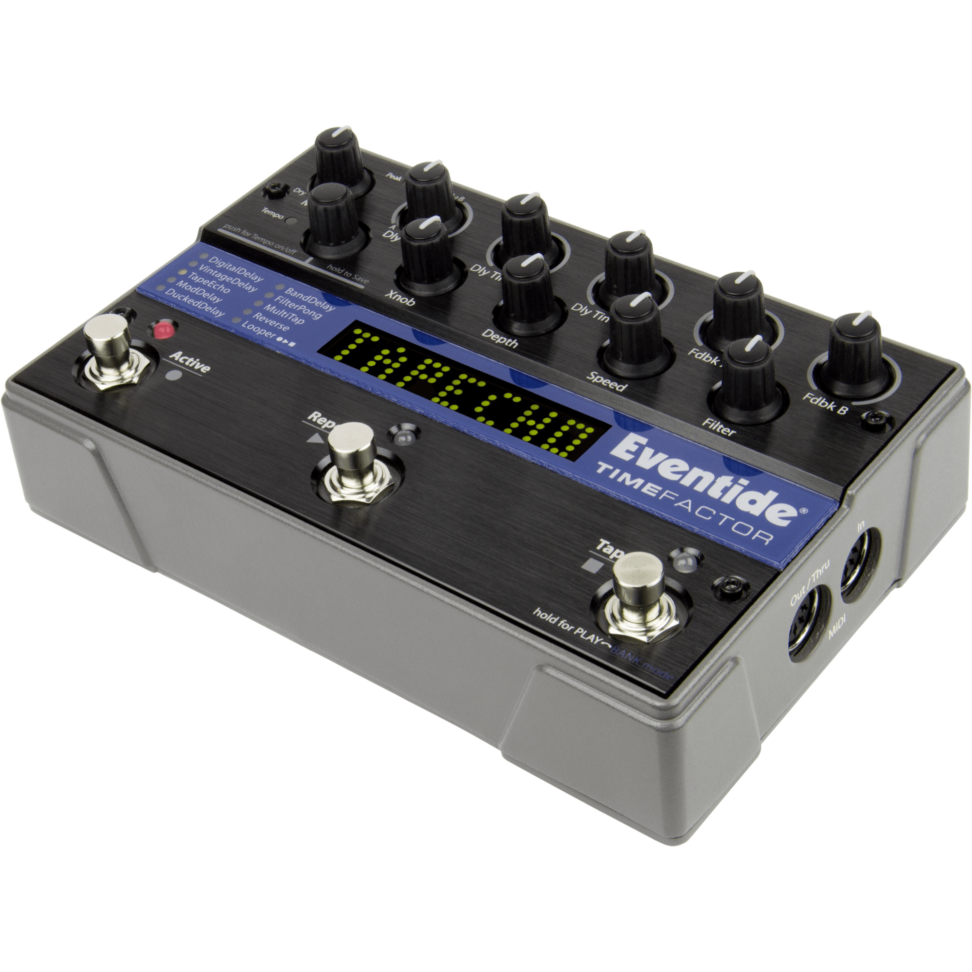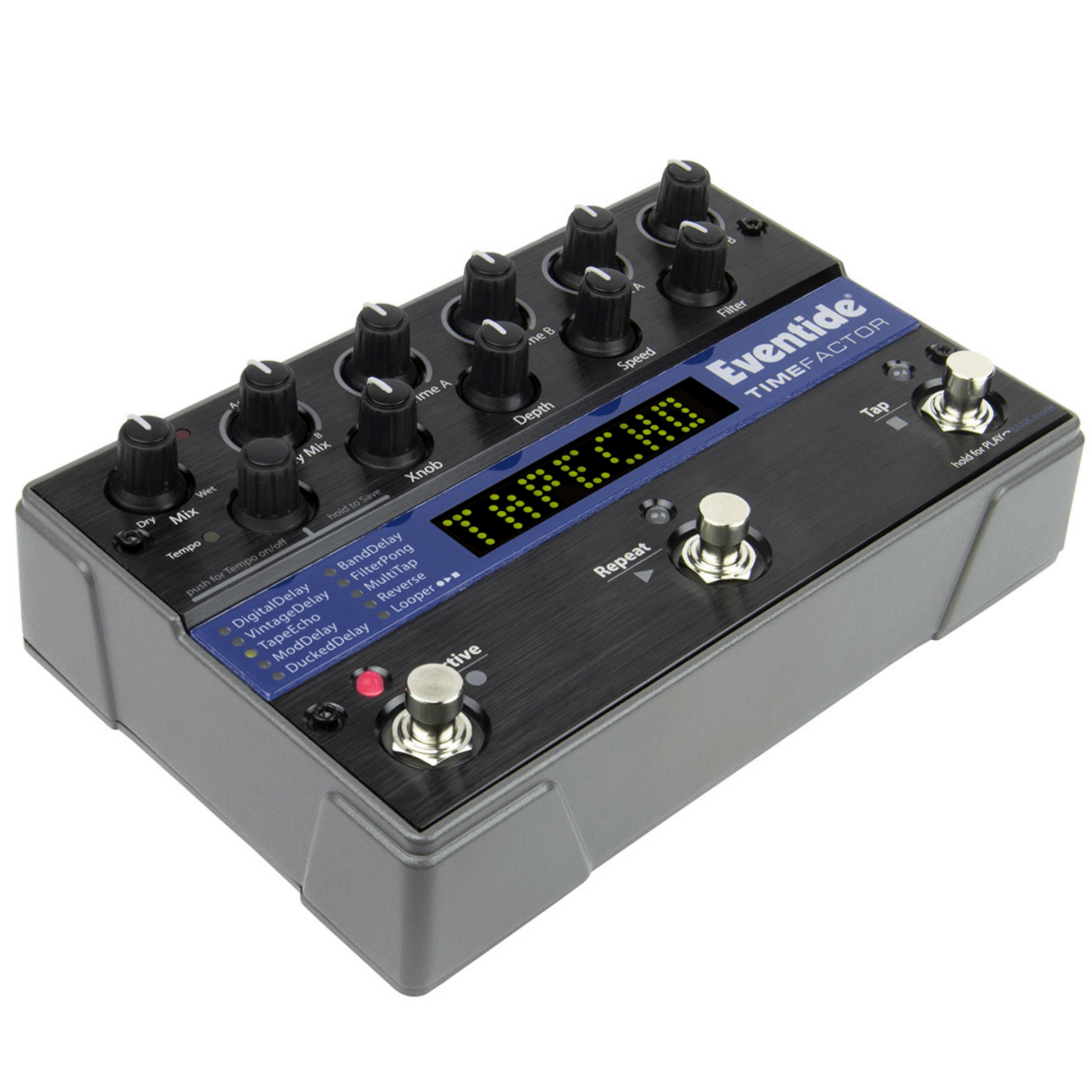 TimeFactor is a comprehensive dual delay pedal featuring 9 delay types with dedicated mix, time, and feedback controls for the two independent A and B lines. Delay types include classic Digital and Vintage, plus MultiTap, Reverse, Mod, Tape, Ducked, and AutoPan. Each effect can operate in stereo or dual-mono or straight mono and each can have its own tempo subdivision for creative rhythmic echoes. TimeFactor also includes a Looper with variable speed and loop head/tail editing.