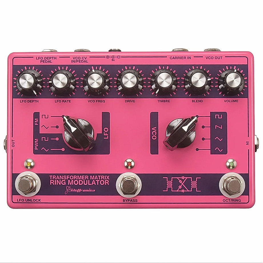 Oct./Ring switches between Ring Mod and Octave modes. The green LED indicates ring mod mode, however (as explained above) it may be partially lit or flash in octave mode depending on the status of the LFO. In Ring Mod mode, however, the green LED will always be brighter than at any time in Octave Mode, even when showing minimum octave drive. (Also, the green LED never flashes in ring mod mode.)