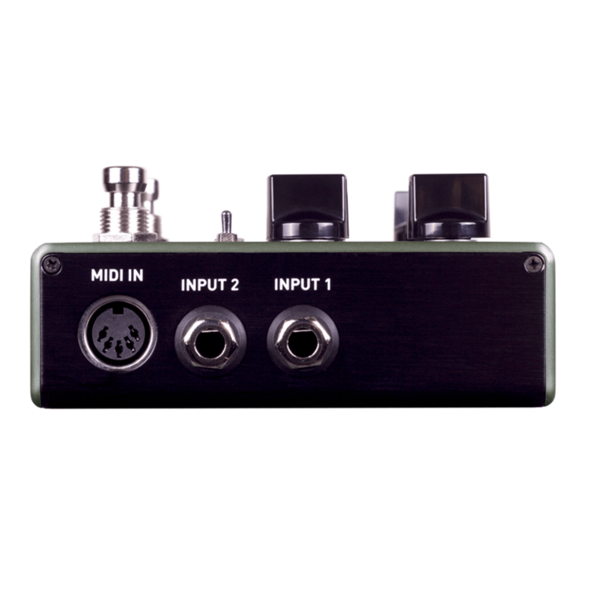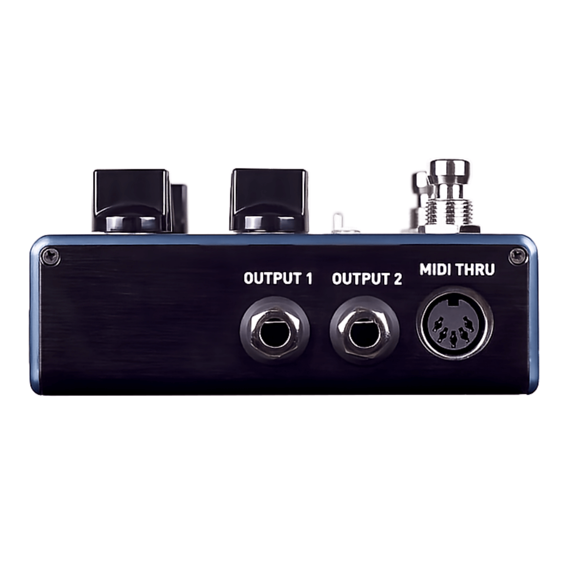 - 5-Pin MIDI DIN Ports — Send MIDI program change (PC), continuous controller (CC), and clock messages to the Ventris via its MIDI IN jack. Pass MIDI messages on to other pedals with the MIDI THRU jack.