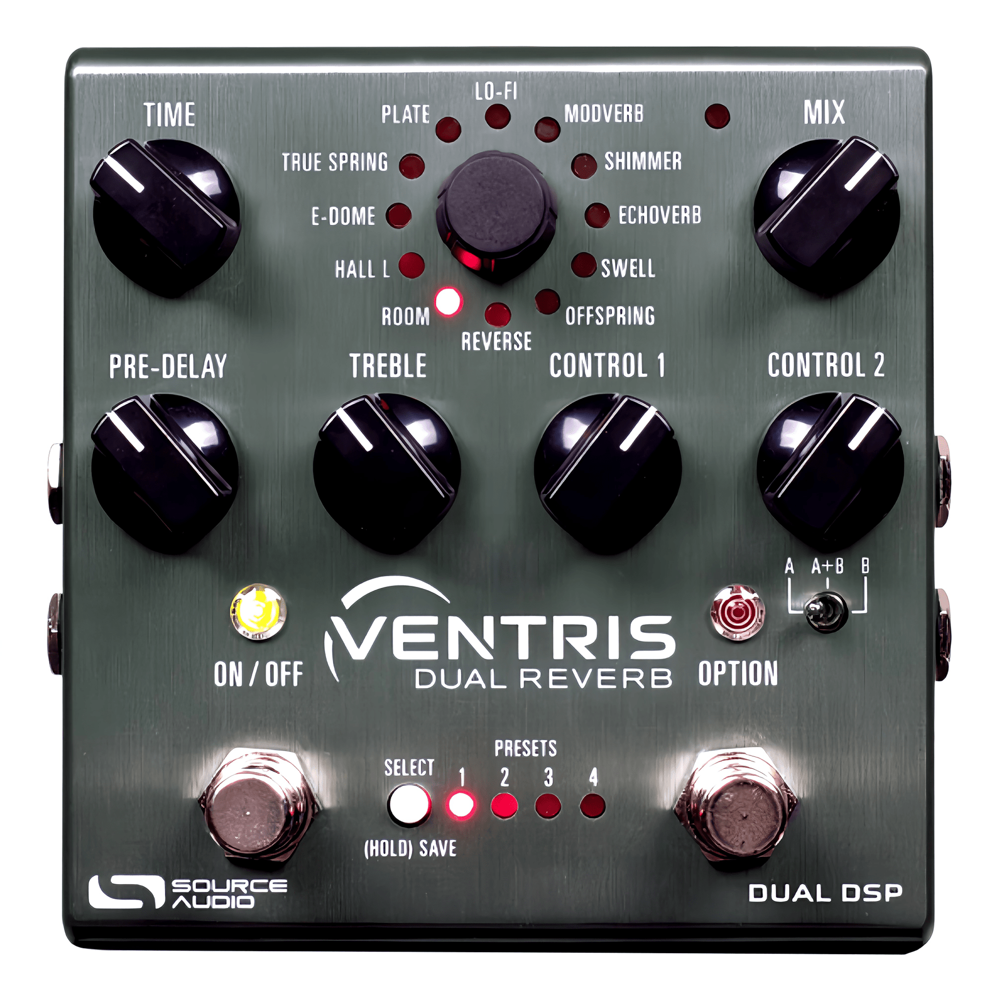 - A to B Reverb Toggling — Use the OPTION switch to toggle between any preset’s A and B reverb, or use it to toggle from a single reverb to reverb A + B.