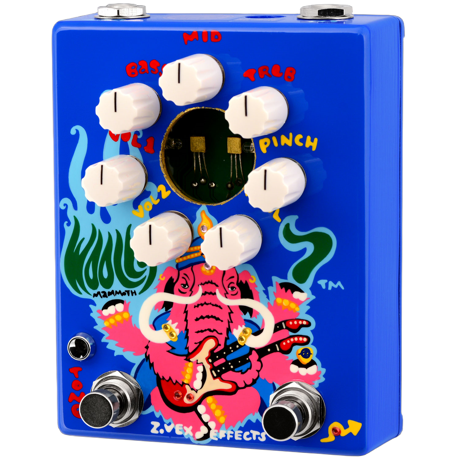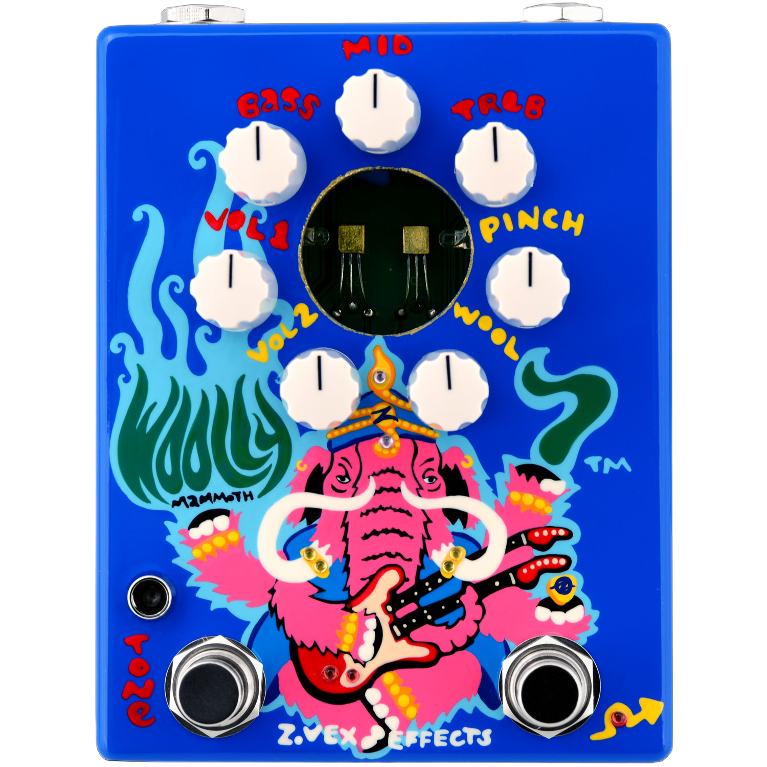 The Zvex Woolly Mammoth 7 features a Marshall ™ style tone stack with Bass, Mid, and Treble controls. This is a departure from the original Woolly with its single tone knob. The tone stack allows for expanded tone shaping capability. Being able to switch it in and out of the signal path makes it a valuable tool for sculpting fuzz into dense soundscapes. The tone stack is switched in and out of the circuit with the footswitch on the lower left portion of the pedal. This feature allows you to bypass the tone circuit completely. The Woolly Mammoth 7 fuzz without EQ has its own unique voice, much different from the sound of a Woolly Mammoth 7 with tone stack, or the single tone knob of the standard Woolly Mammoth. The fuzz is more linear, with pronounced mid frequencies.